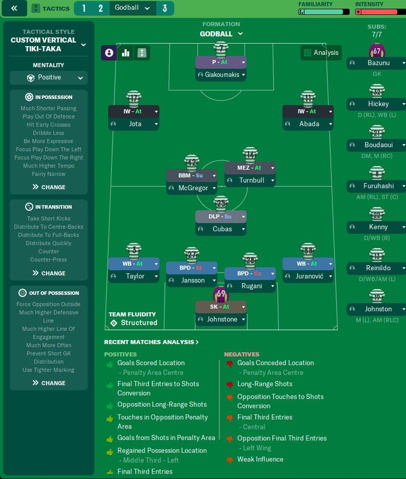 I created my tactic based off of Vertical Tiki-Taka to create a fast paced possession dominated tactic for my team (Celtic) to use. My manager's name was "The God" and when I beat my rivals (Rangers) 4-0 the media interviewed me and named the tactic "God-ball" so I have taken the name and run with it. It personally works very well for me but I need opinions. All opinions are welcomed (Including criticism) so please try it out and speak your mind.
