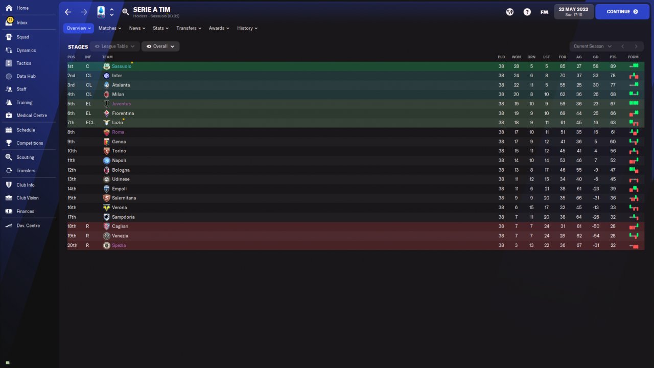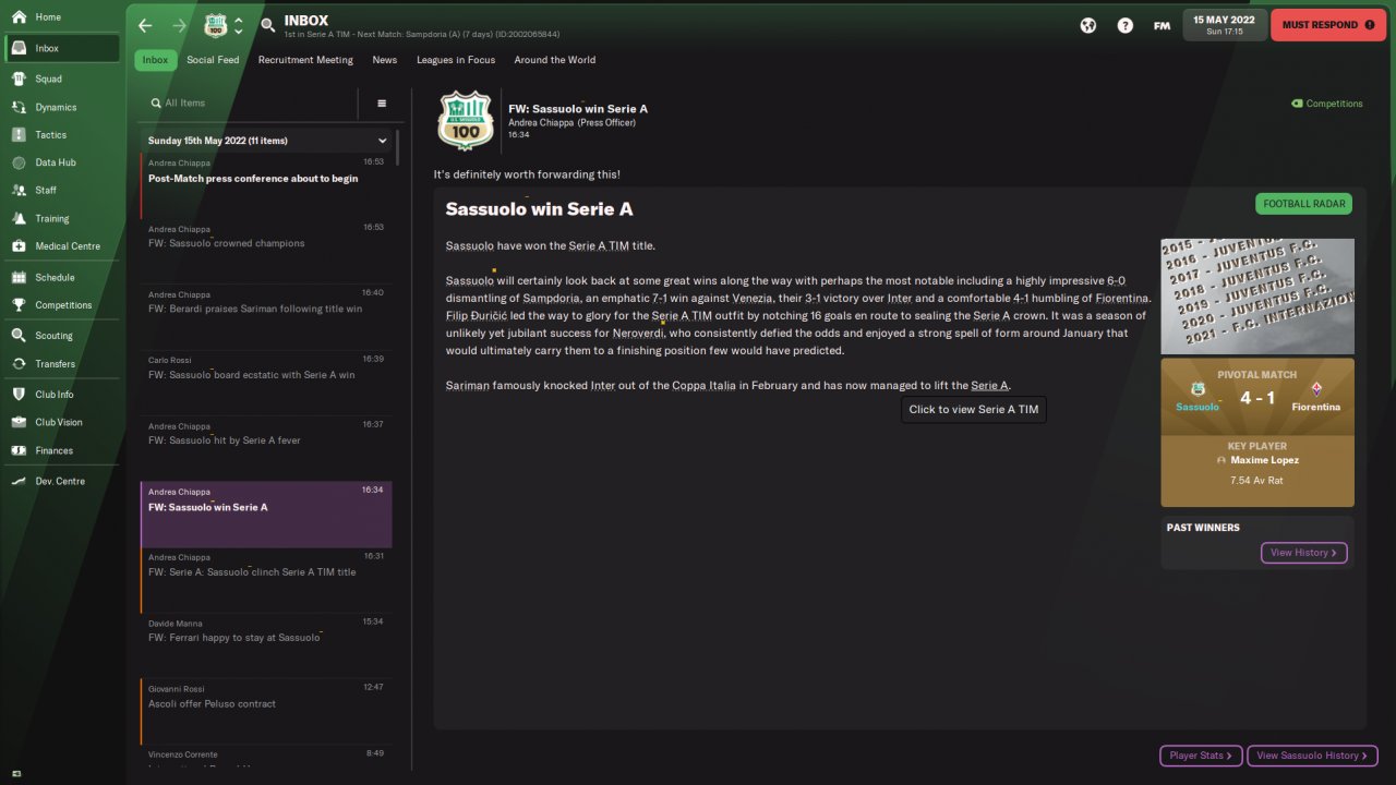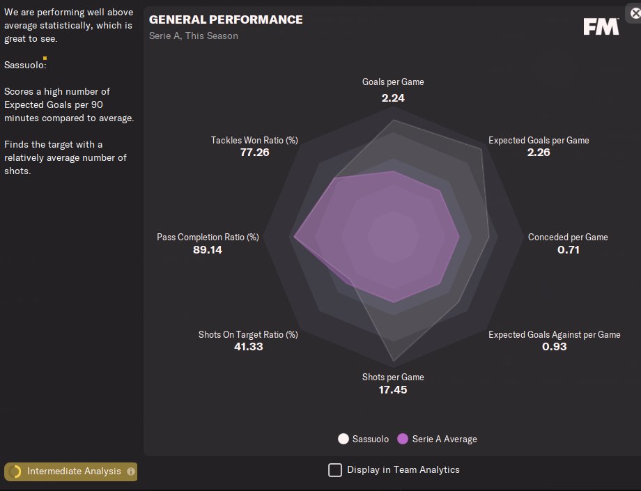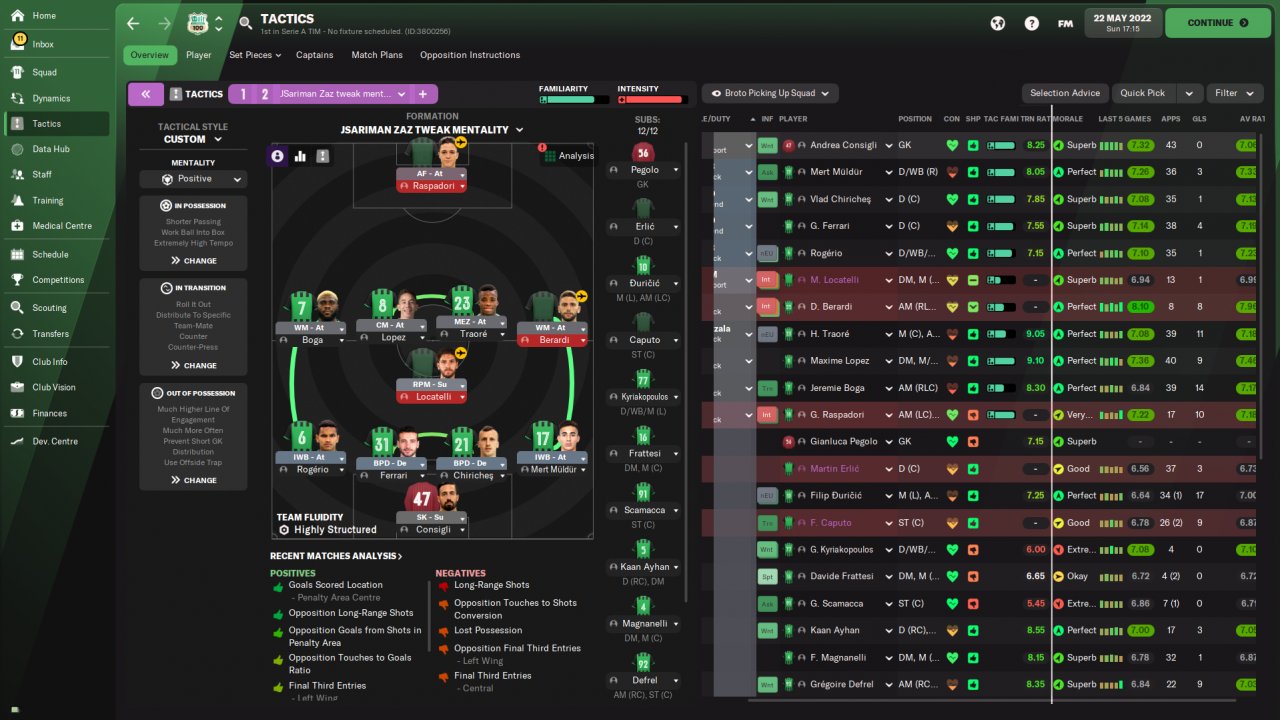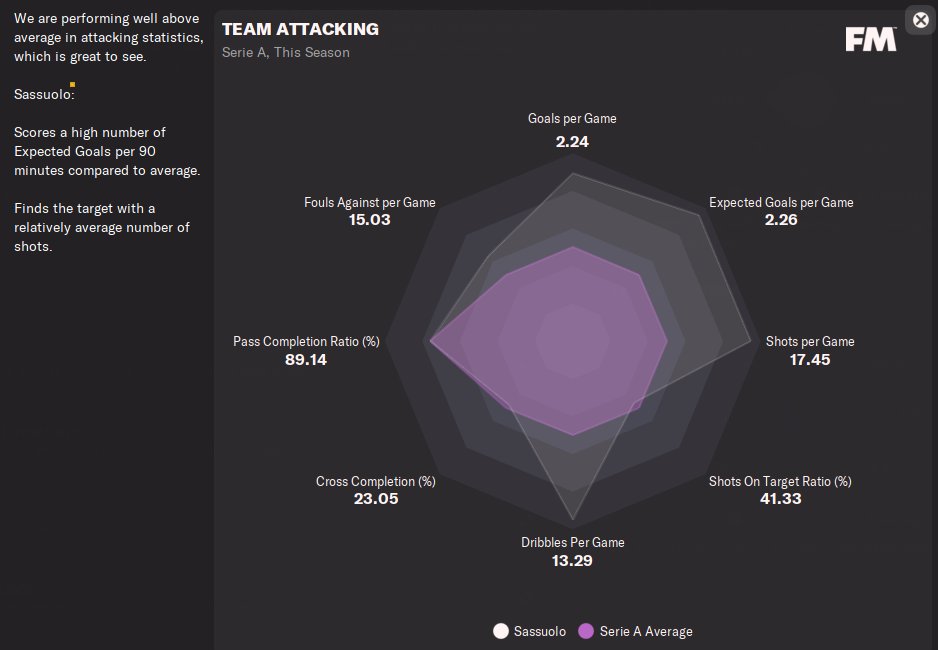 Amazing results amzing year with Sassuolo!I have to suggest you if you want to use this 4-1-4-1 to play with speedy players especially wingers! You need also a speedy striker or a striker with good finishing and pace at least 13-14.Speedy central defenders also.