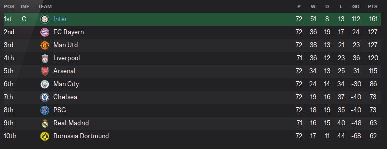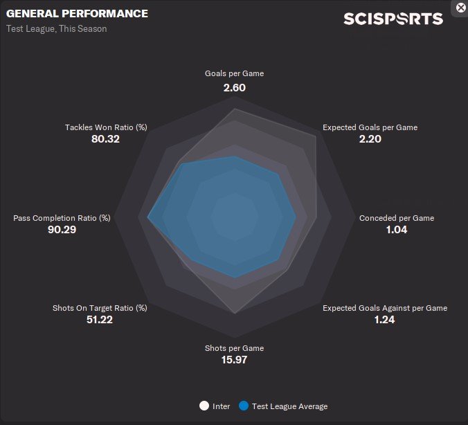 Collaborated with MomentaryBlink to share a testing database. Top 20 teams in the world, 76 game season, no continental or domestic cup competitions, all teams have injuries and suspensions wiped at the start of the test. Upper mid-table Inter and lower mid-table Napoli were used for the tests to most closely mirror Team A and Team B in the FM-Arena tests.
