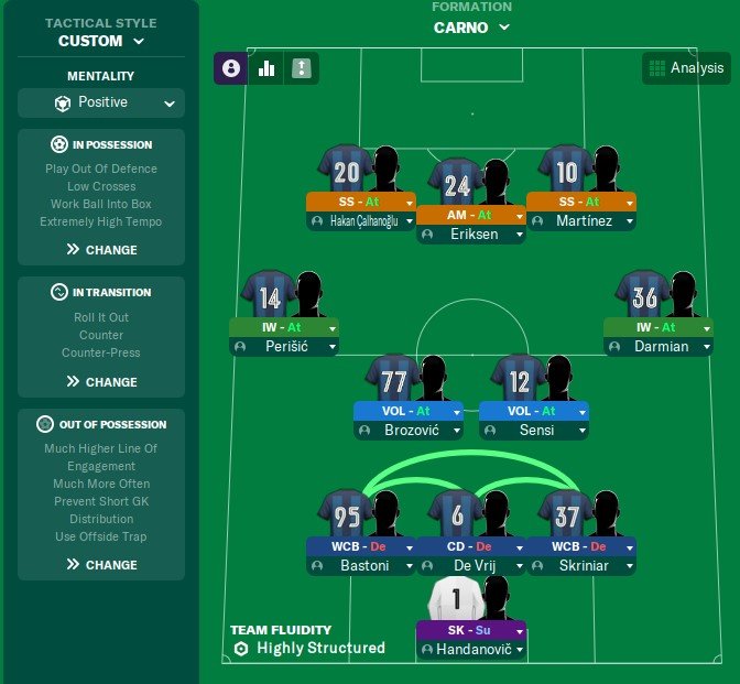 This is a new shape I am trying out and have found some success within my testing league. The idea is to find a three at the back tactic that will provide high output scoring with overloads in the middle. Name comes from the Carnotaurus which I feel like resembles this shape as the goal is just to eat the other team alive and the shape of the Attacking Midfield Reminds me of the bull horns of the Carno.