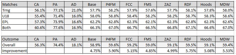 These oddities mean we have a few more groupings now. Overall we have 176 players we are looking at. Each test will cover around 40 games for EPL/cups and for U18s. So players will be playing 30-40 games a test, with 5 tests per training schedule or 150-200 games to analyze each schedule. We will have them all training for 10 months per test run or around 43 weeks each test, 215 weeks each training schedule.
