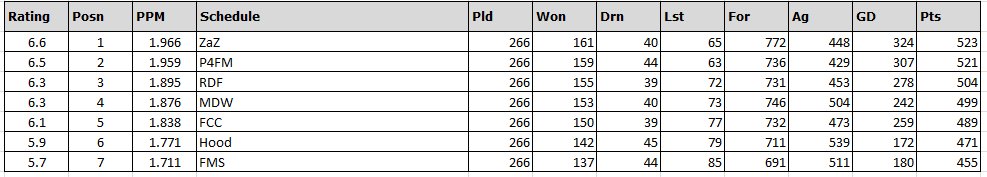 Mark said: Well we have the results in for the Training Schedule performance tests. I had to change from the original plan as the League of Nations testing environment doesn't allow for training. I went back to the ZaZ EPL environment and once again healed all players at the start of each run. I ran 7 tests with each schedule cycling through each of the 7 teams. As each only has one run with each schedule it is open to impact by injury or send offs so there is a fair margin of error in this test.