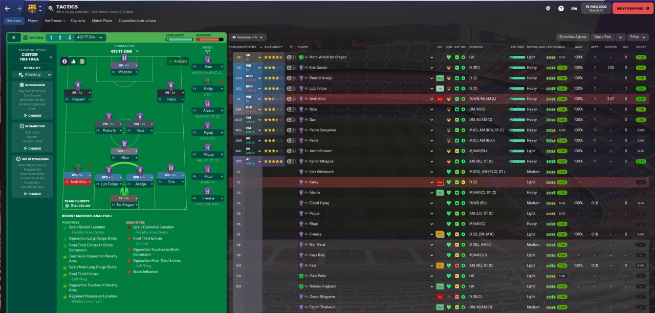 So far, I've only really used this tactic in my attempt to save Barcelona from itself, so TBD how well it translates to other teams. I wanted a true attacking, possession tactic in Barca's traditional 433 and have succeeded in doing so, at least in my save. This tactic or slight variations on it have been pretty stable since the beta. I sometimes revert to a more balanced variation after taking the lead to conserve energy, or tweak the CMs and/or WBs to play more conservatively against better teams. In general, it's a little bit more slow-paced than the top-tactics with some unique instructions and roles, which helps with possession.