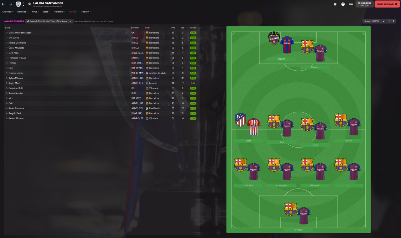 The majority of goals come from the ST position, followed by a pretty even split among the two CMs and IWs. Plus plenty of headers from the CBs off of corner kicks. You can also see from the team of the season that my players get pretty good ratings across the board - Trincao and Gavi were my primary corner takers and their ratings were definitely boosted from the many assists they got from doing so.
