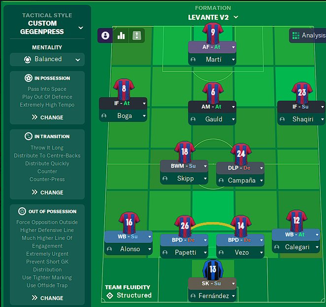 I've created loads of tactics in FM and I've started testing them in a CA165 test league as well, but so far nothing I've made has come close to one of my first tactics, "Levante v2". Originally made for Levante with Campana as DLP(D) and Bardhi as AM(A) and this finished 3rd place in the first season of my La Liga save, and then 2nd place in the following season.