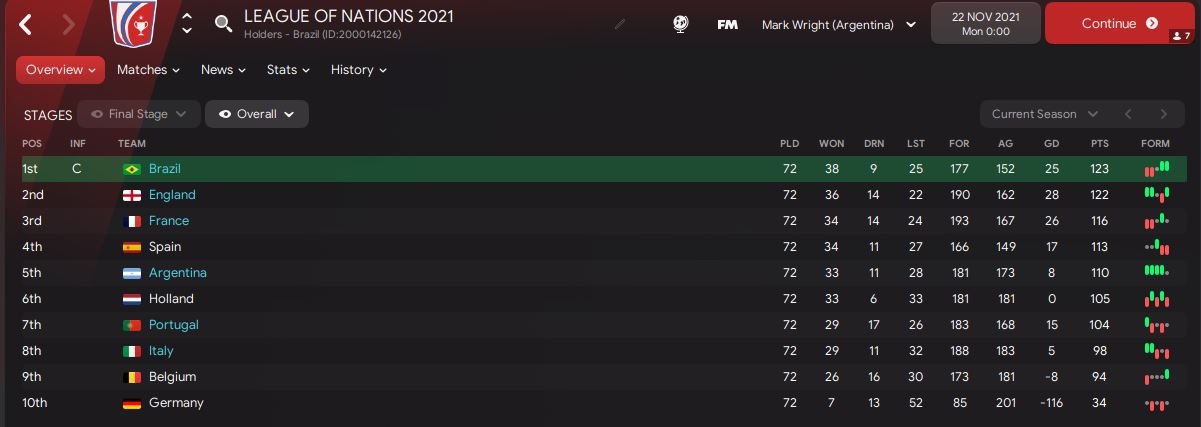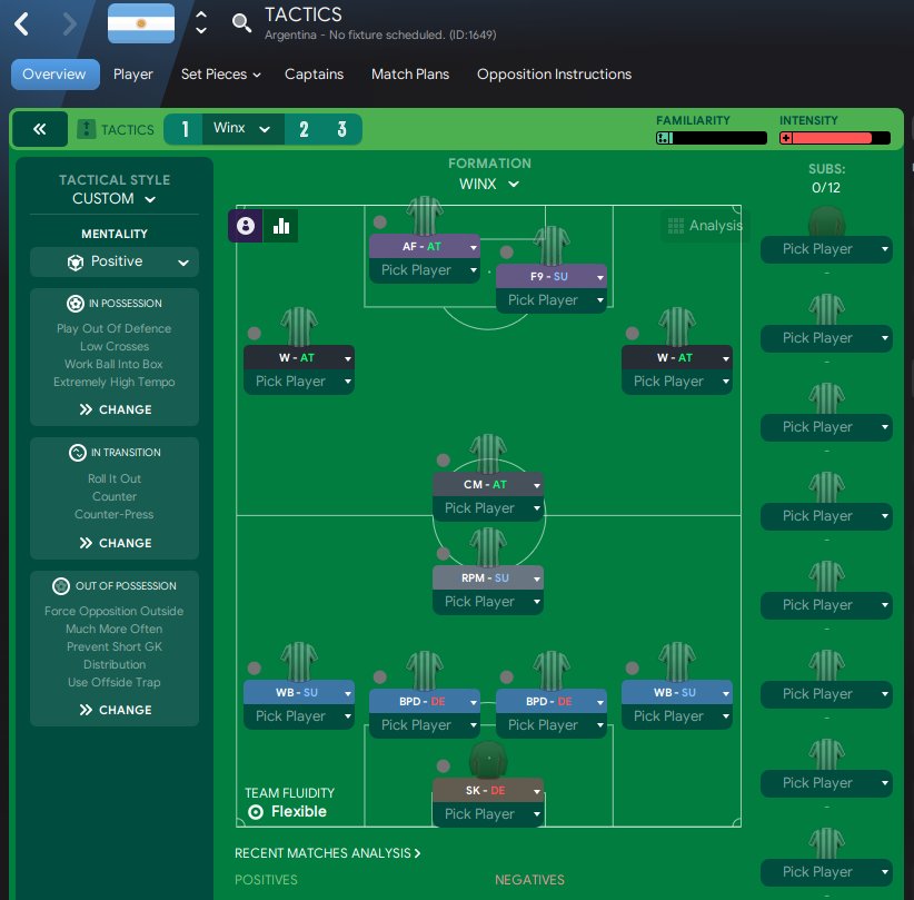 I have based this tactic on Dragons Breathe with the wingers moving forward. There have been substantial changes to team instructions. I tested it in the League of Nations test league using the top 8 tactics from FM Arena. This is the best result of any tactic I have tested in this league. The test side is always Argentina which is rated lowest in this League. Very good tactics have struggled to finish above 9th. 5th is very impressive.