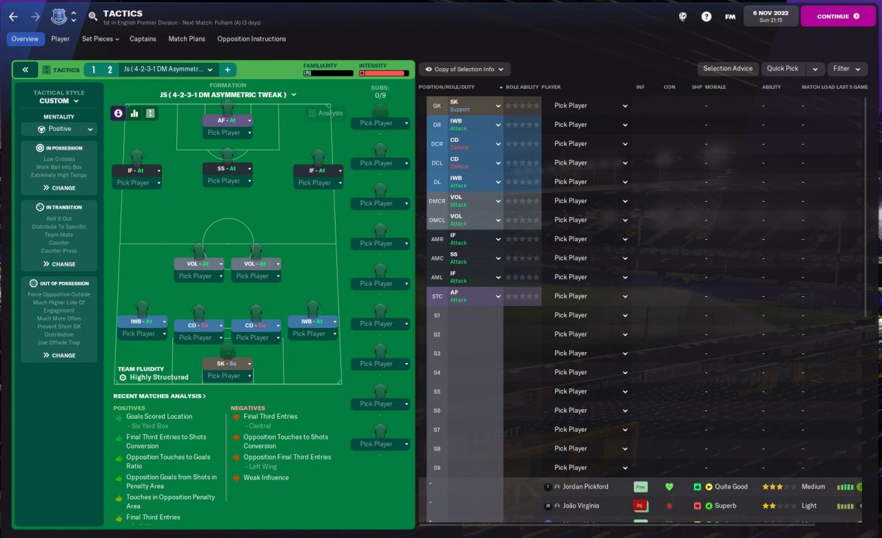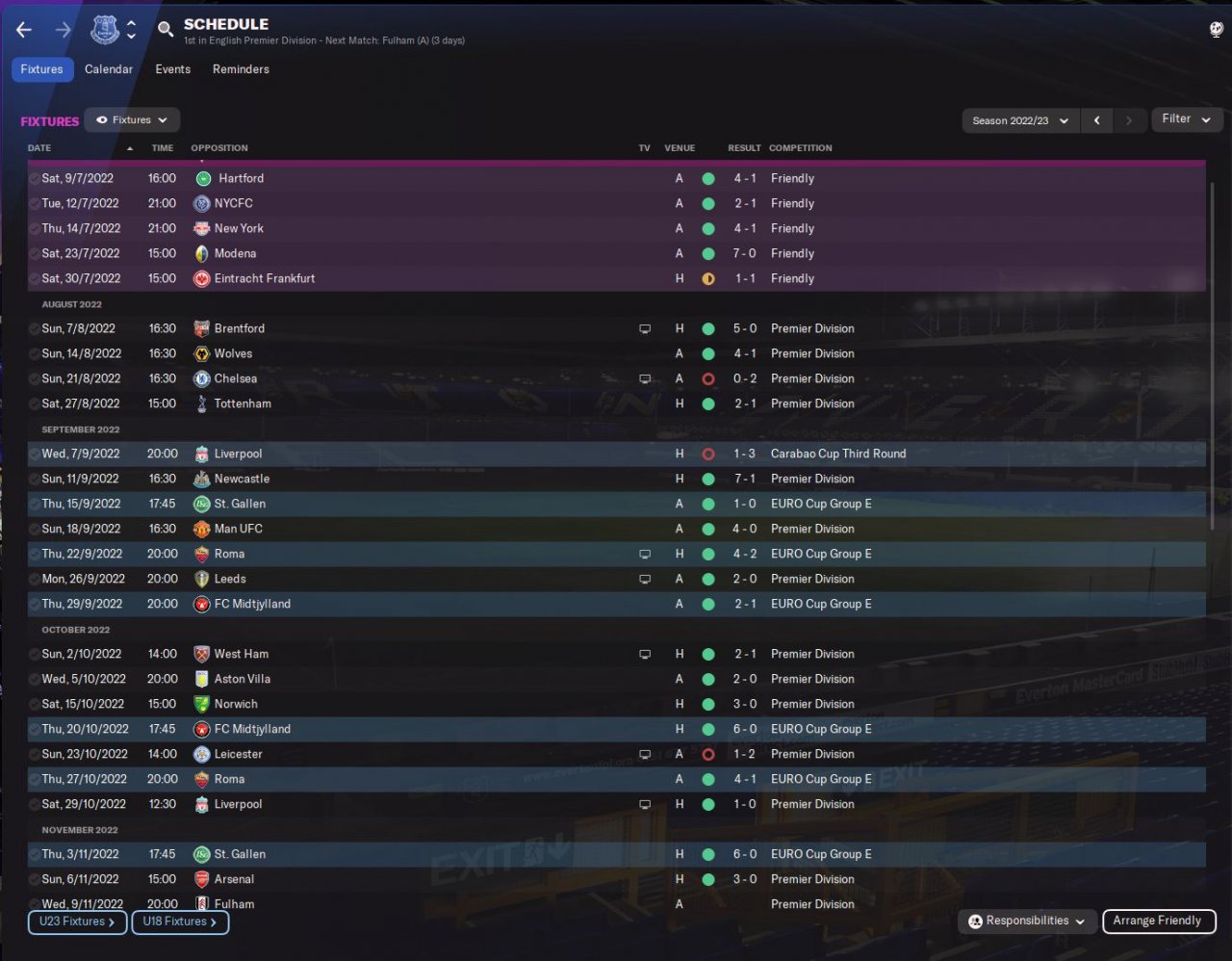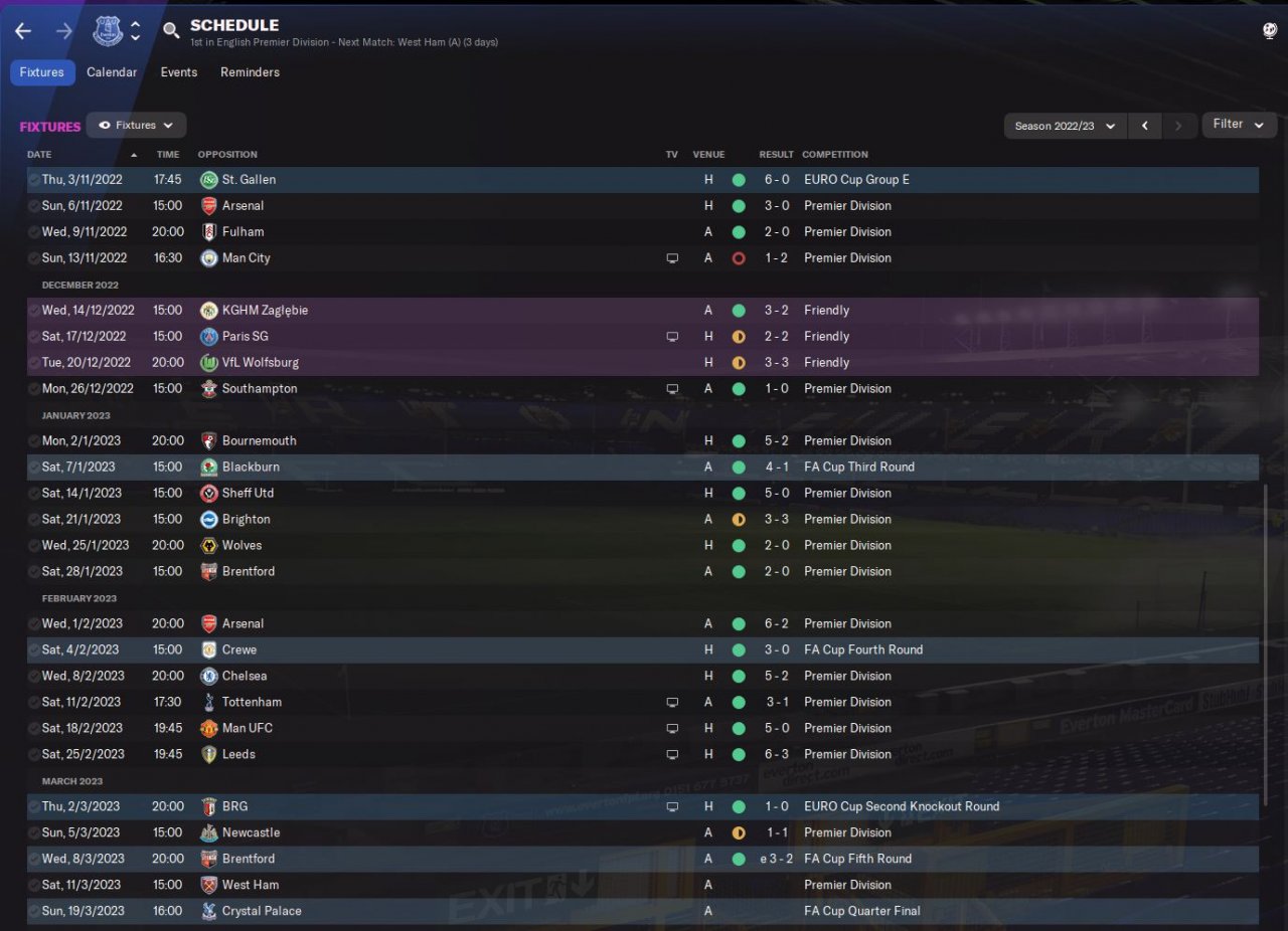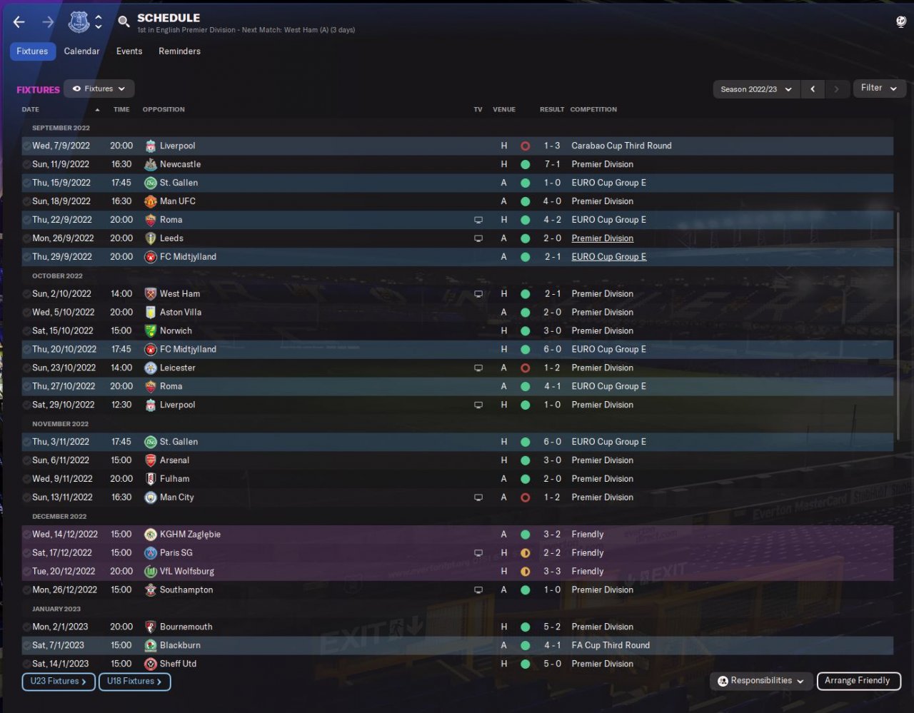 Just the one defeat since I switched to this formation, a freak result away to Leicester where my Xg was 2.28, I have won every other games including a 4-0 win away at Man Utd, beating Liverpool 1-0, winning 4-1 away at Roma and beating Arsenal 3-0. See schedule in screenshots...