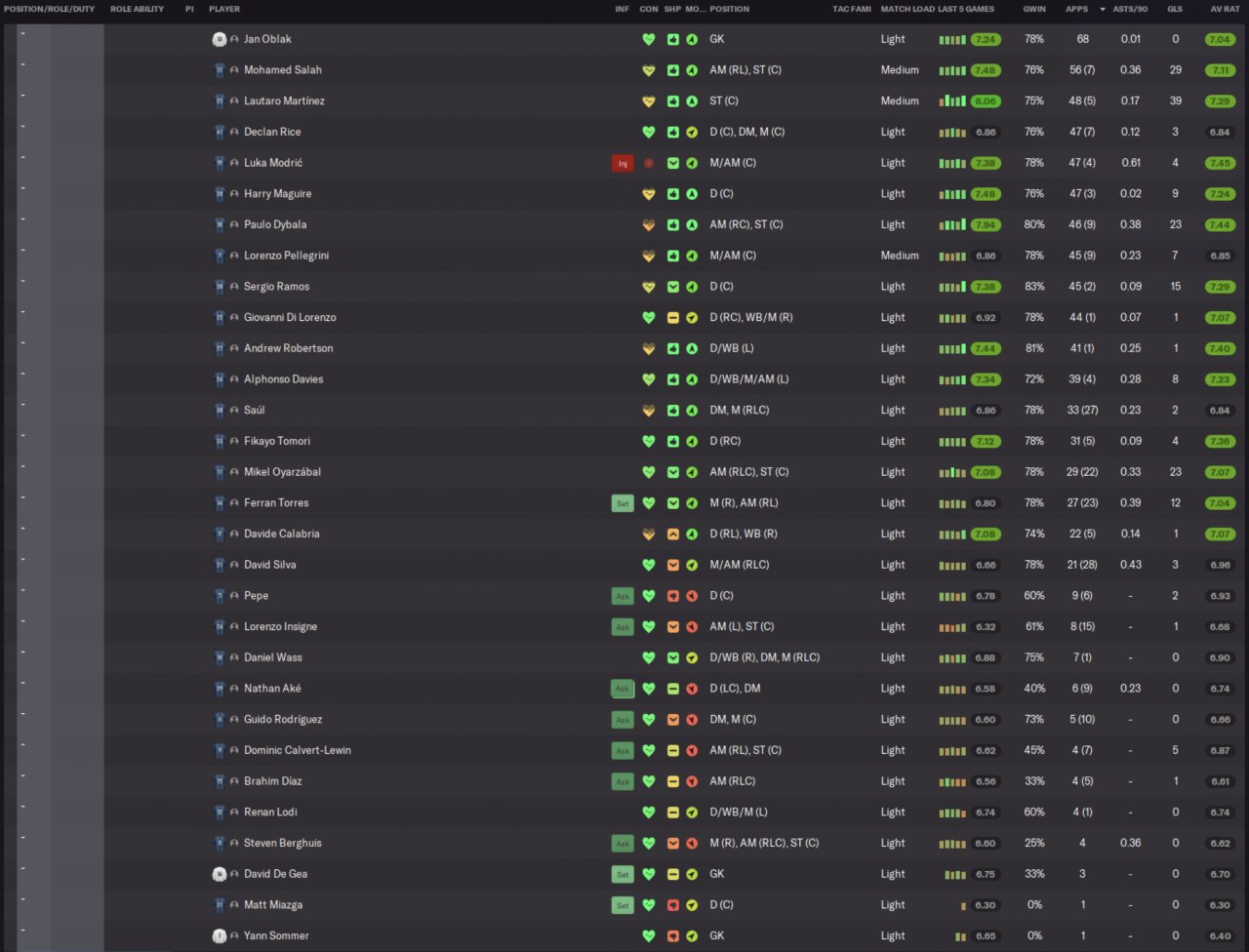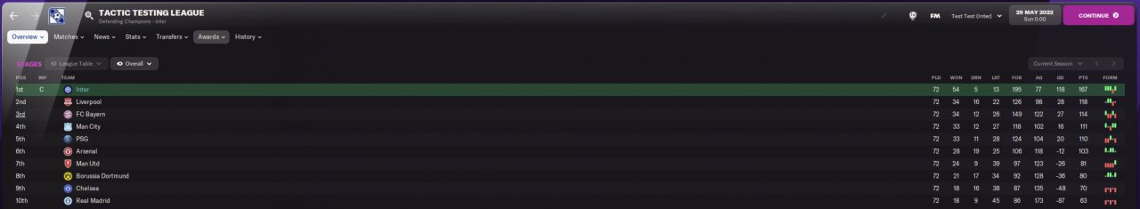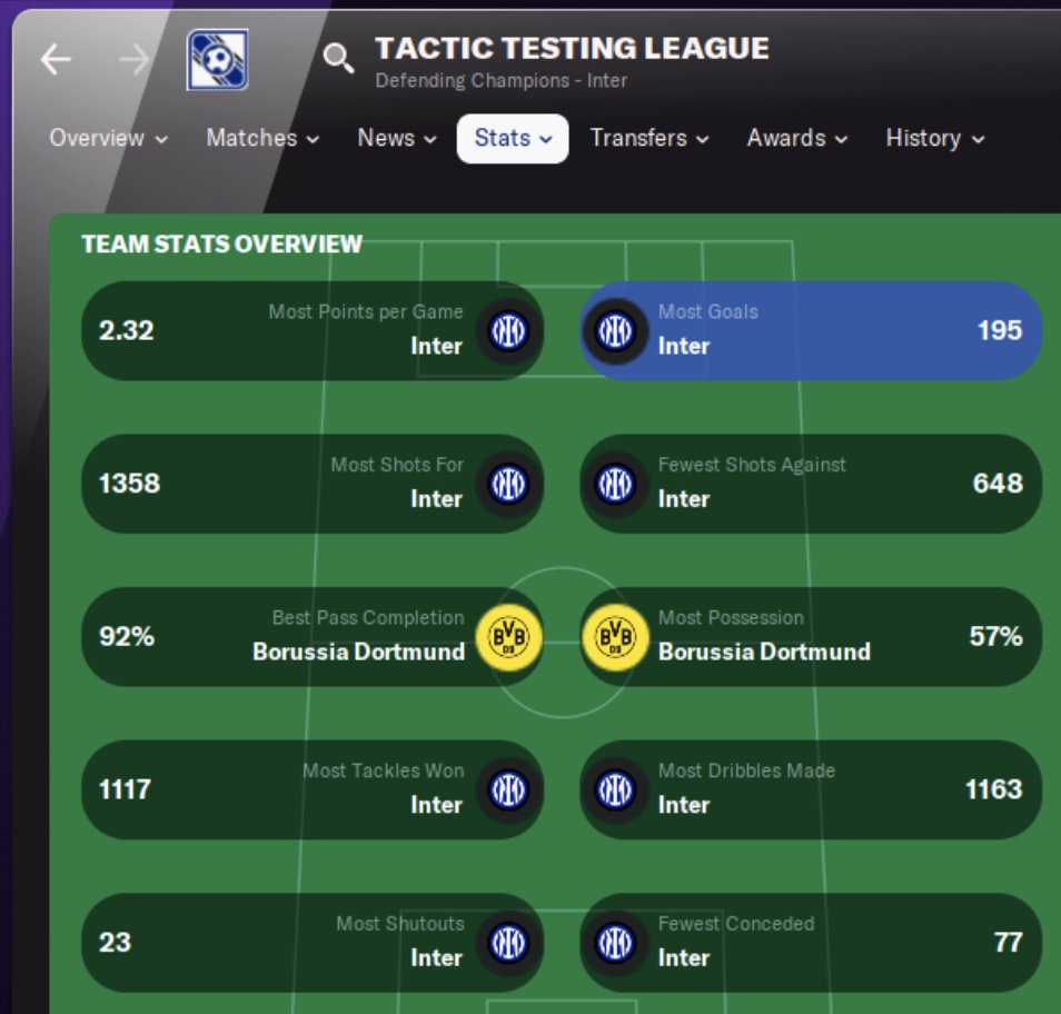 Methodology: This tactic was tested on the database that I made with Dino. 10 teams, 72 game season. The teams do not have their original rosters. Instead, the top 30 players in each position on the pitch were divided evenly among the 10 teams to provide a flat league structure. Each team is "human controlled". We have assigned/locked-in a base AI tactic to each team, then put an unsackable human manager on holiday. This is to ensure that the tactic faces a spread of tactics that the AI is likely to use. Two variations of 4-3-3, 4-2-3-1, and 5-3-2. 4-4-2, 4-2-4, 4-1-2-1-2 all make an appearance as well.