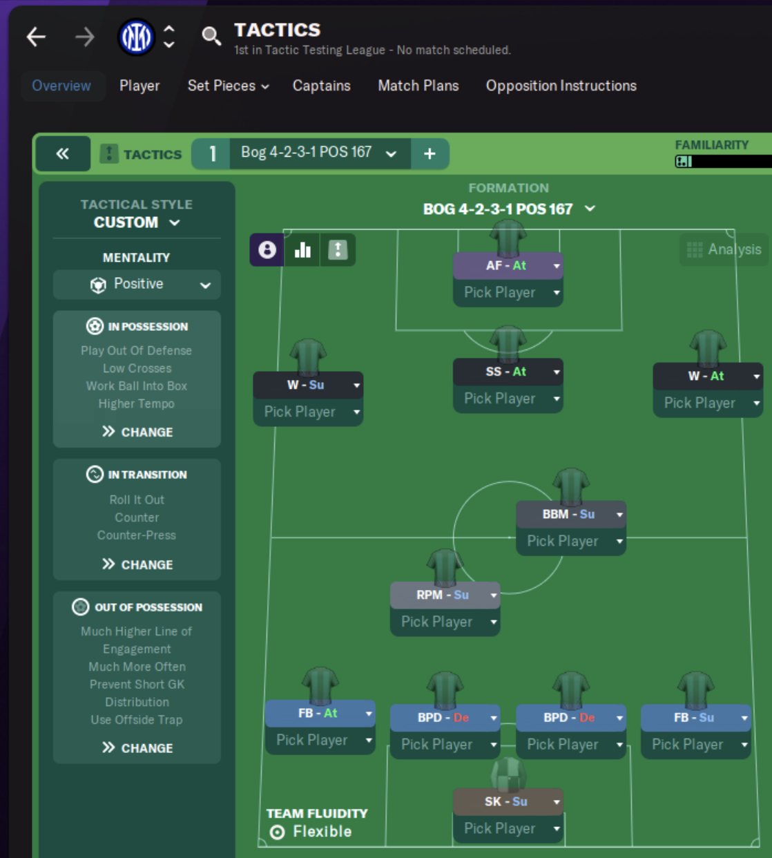 Overview: I decided to try something different. Previously I've worked on my own Arrowhead and Blink tactic, and even tried some variations on Rush and my own strikerless builds. However, I was challenged on stream to work on something more "standard". I decided to try and make a successful 4-2-3-1 that could control possession, score goals, and prevent goals. Some of the role inspiration is my own, some of it comes from ZaZ and some from Dino. I think there are still some necessary tweaks, but I'm very happy with the results so far!