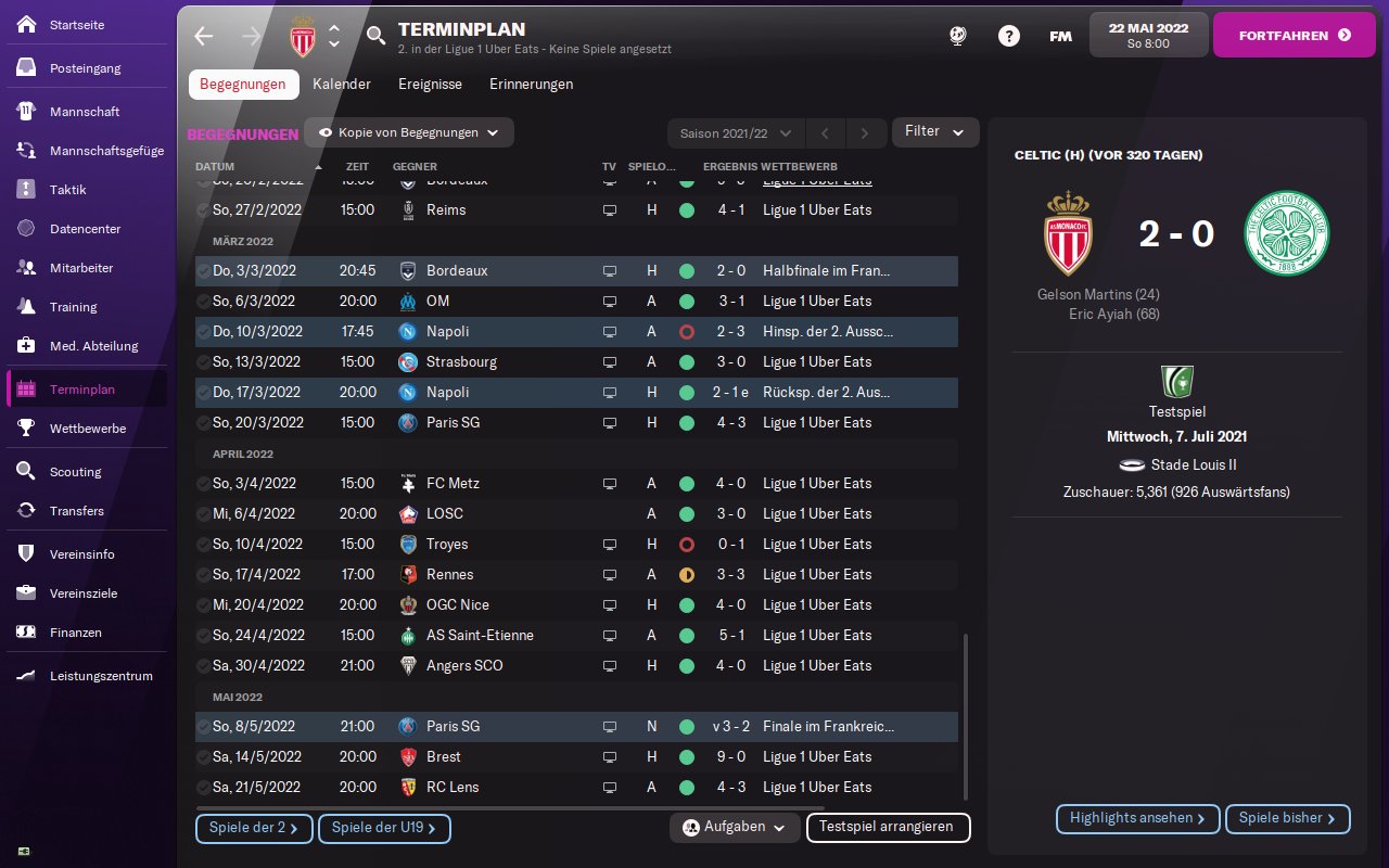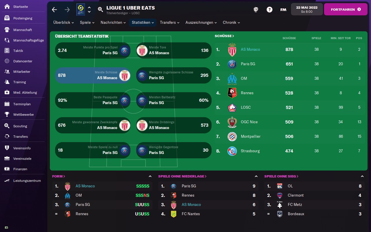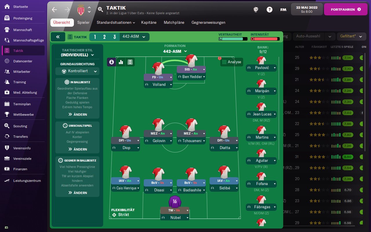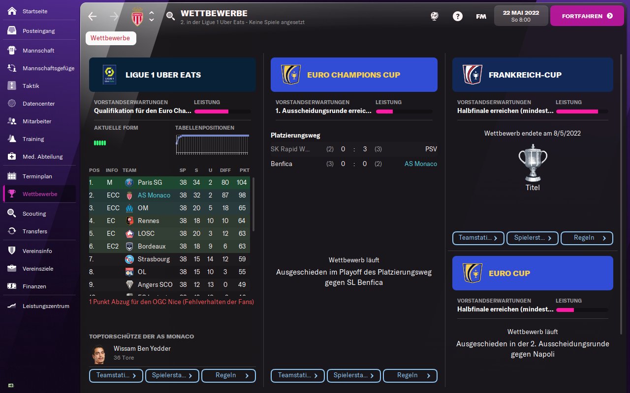 That was one of my best seasons I ever had and I played it manually so not on holiday. 98 Points with Monaco (unfortunately PSG is just too good, so only 2nd place). I crushed so many opponents and scored 136 goals in Ligue 1. My only Transfer was Calafiori on loan from AS Rom in the winter transfer period because I had some injuries at the fullback position at that time.