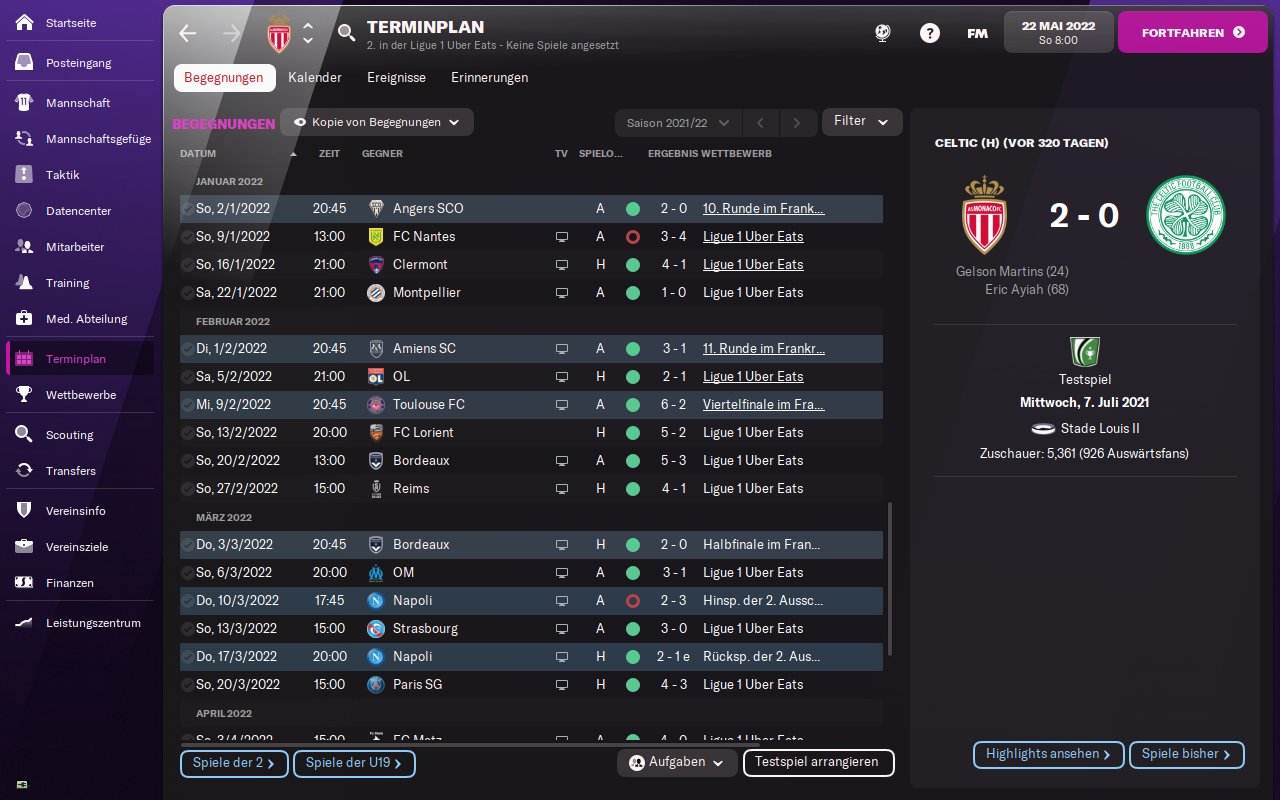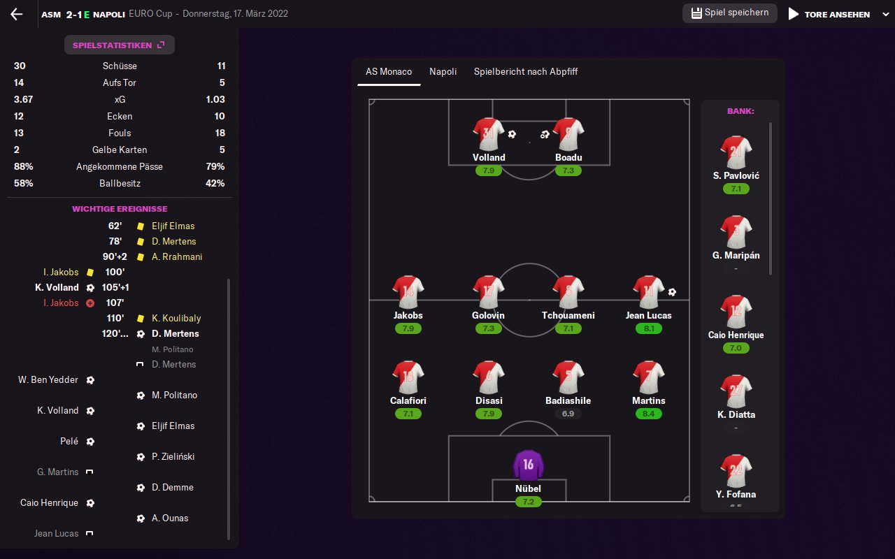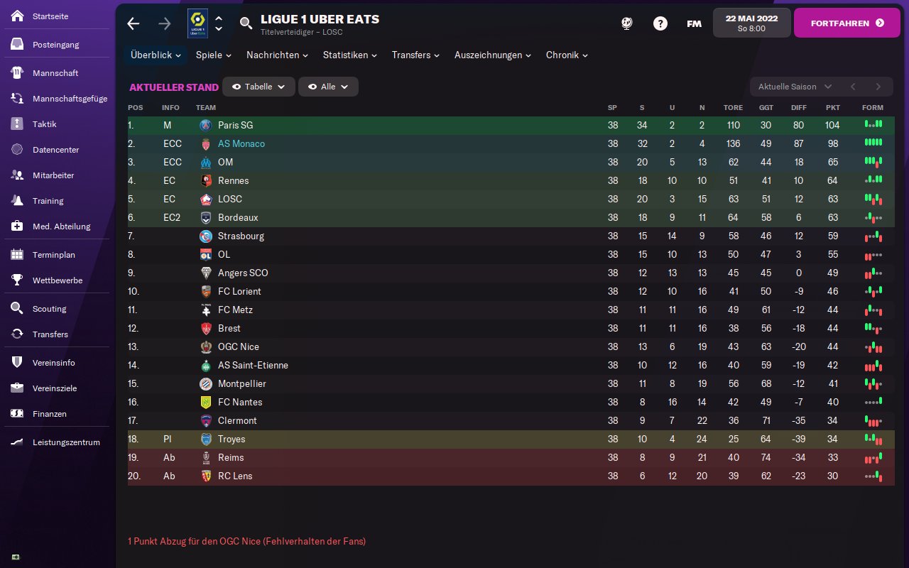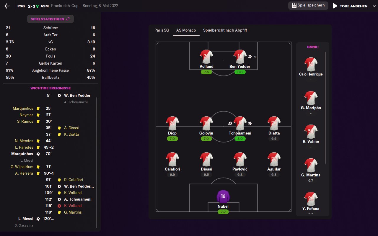 That was one of my best seasons I ever had and I played it manually so not on holiday. 98 Points with Monaco (unfortunately PSG is just too good, so only 2nd place). I crushed so many opponents and scored 136 goals in Ligue 1. My only Transfer was Calafiori on loan from AS Rom in the winter transfer period because I had some injuries at the fullback position at that time.