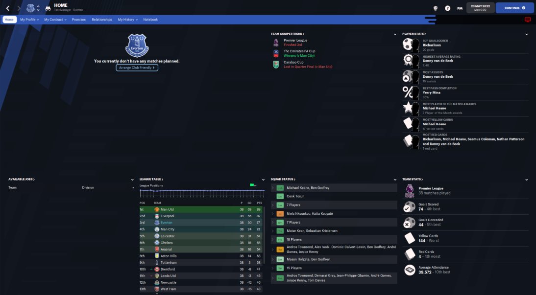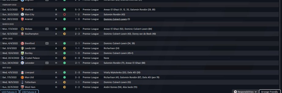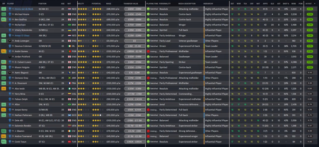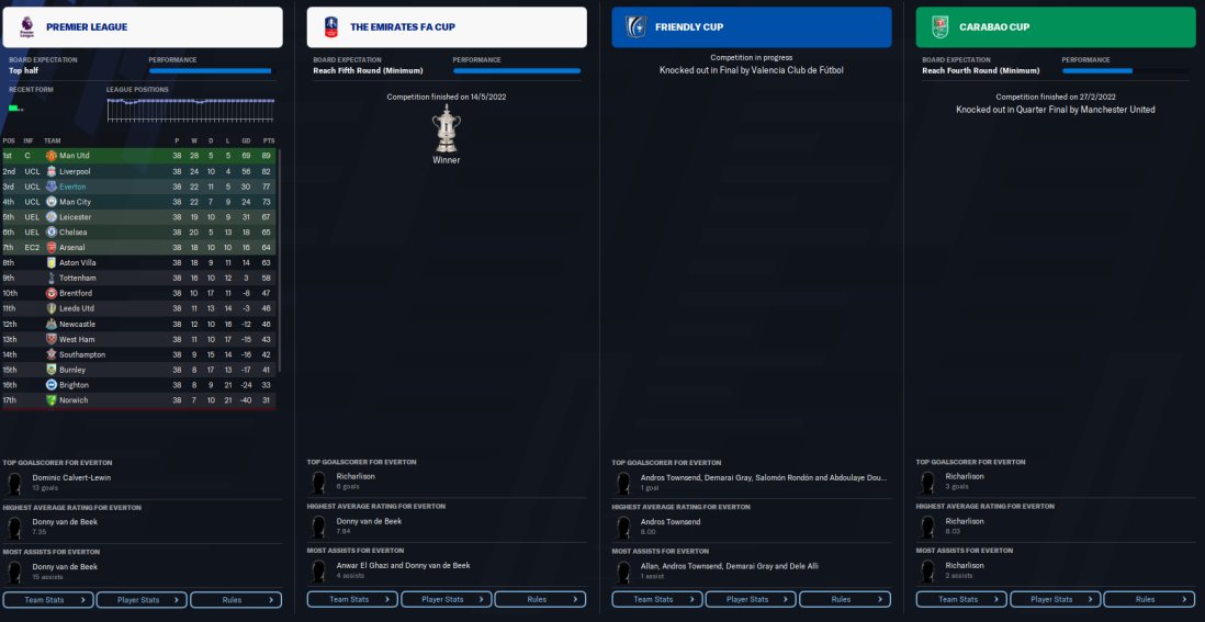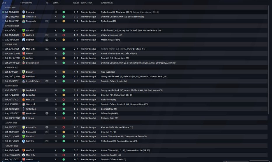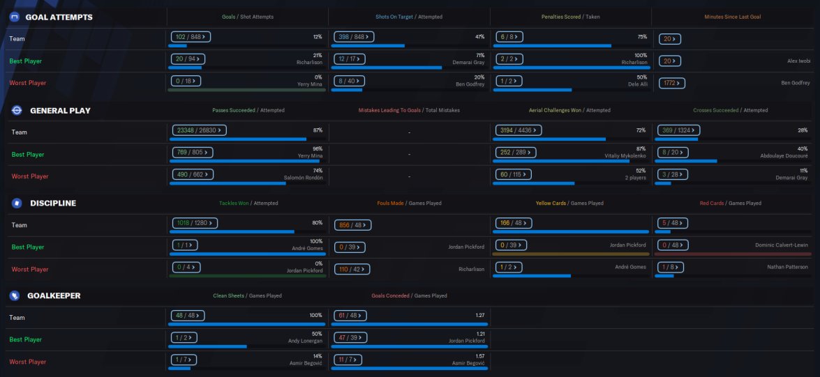 Everton predicted 11th, finished 3rd and won FA cup. Richarlison top scored with 20 goals, Van de Beek with 19 assists.