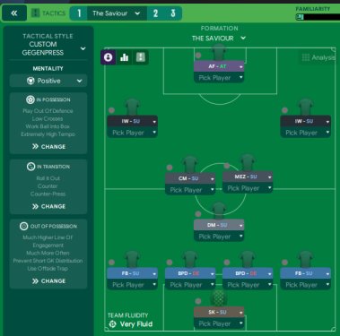 I have used the TIs that I know are very effective, SPs are similar to the ones FM arena posted about the other week. I've only gone with 1 attacking duty, however the PIs on the FBs, CM, Mez and IWs are those of an attacking duty in them roles. Effectively the FBs are IWB on attack duty but by using FBs with the IWB PIs, I just felt the tactic had a little more stability. I haven't added sit narrower on the FBs as I wanted them to stay wider to hopefully reduce the number of goals conceded via crosses