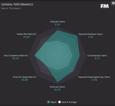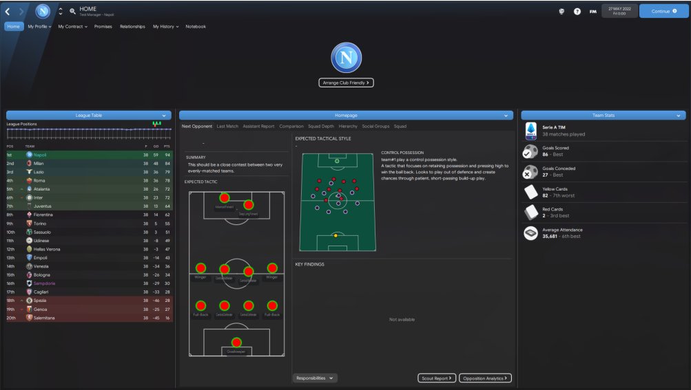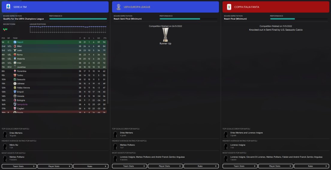 I messed up here with the screenshots as I forgot to get the squad screen and analyst report screenshots but as you can see Napoli won the league scoring the most and conceding the least. 94 points achieved and got to the final of the Europa league where we got beat off PSG. I believe Mertens scored 26 goals but I don't know in how many games.