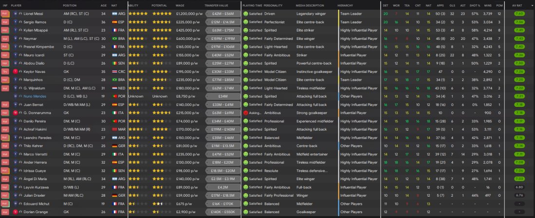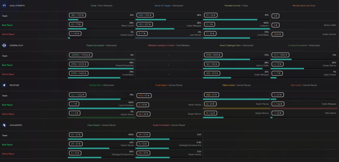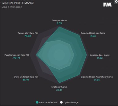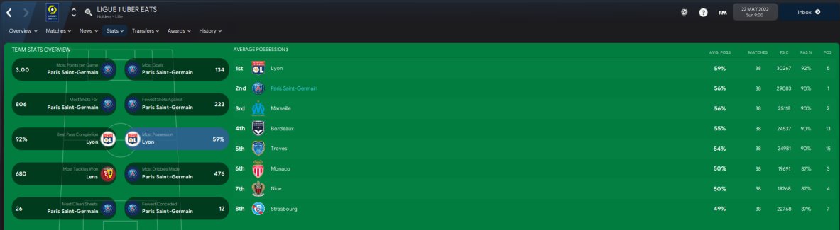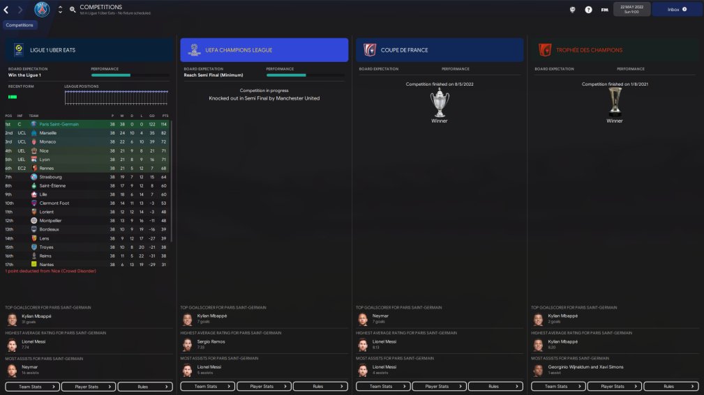 PSG won 38 out of 38 games in the league, winning the treble overall after narrowly being beaten off Man Utd in the CL semi final. 134 goals scored with only 12 conceded in the league. Mbappe scoring 41 in 56. Messi had 55 goal involvements in 53 games.