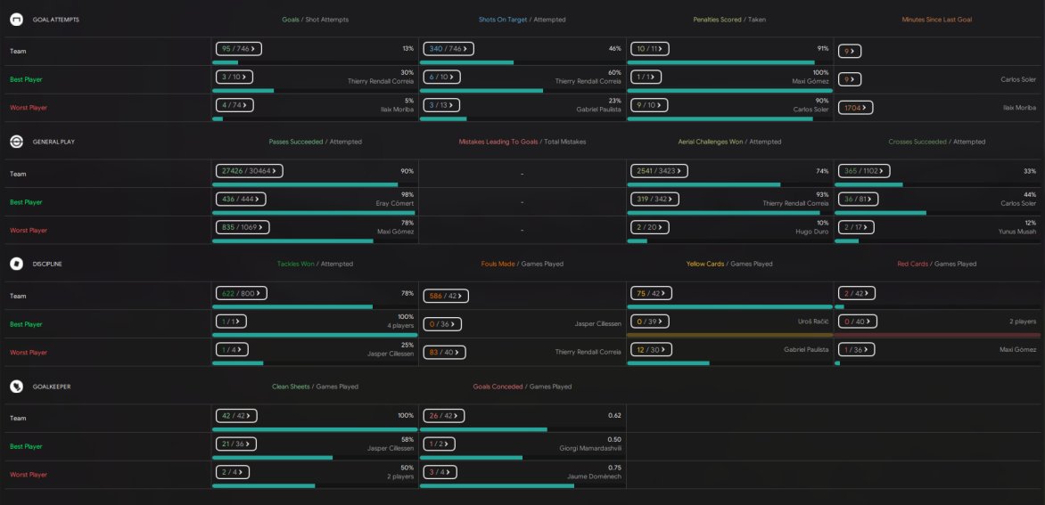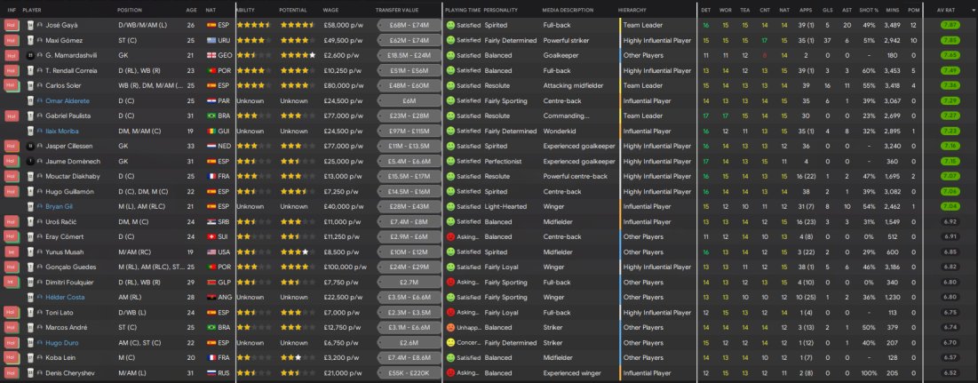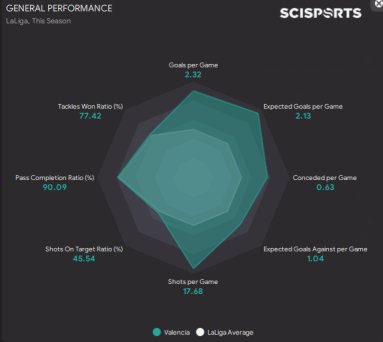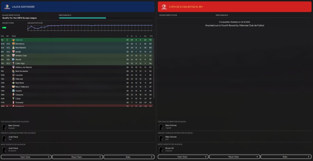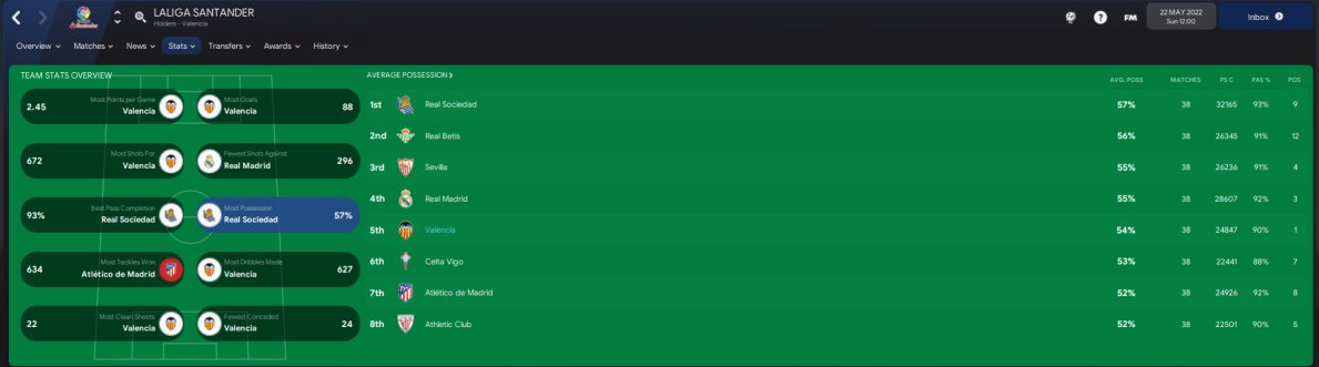 Valencia won the league with 93 points, scoring 88 goals and conceding just 24 goals. Best in the league in both scoring and conceding. I believe Valencia are predicted 7th. Maxi Gomez top scoring with 37 in 36.