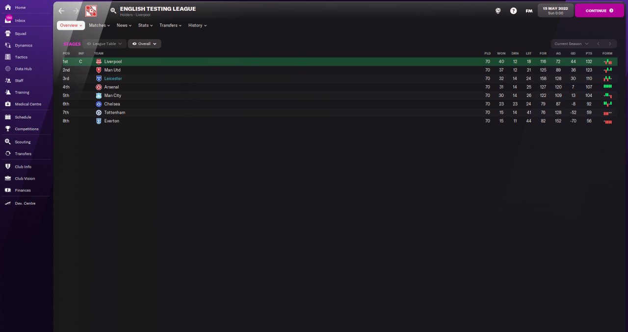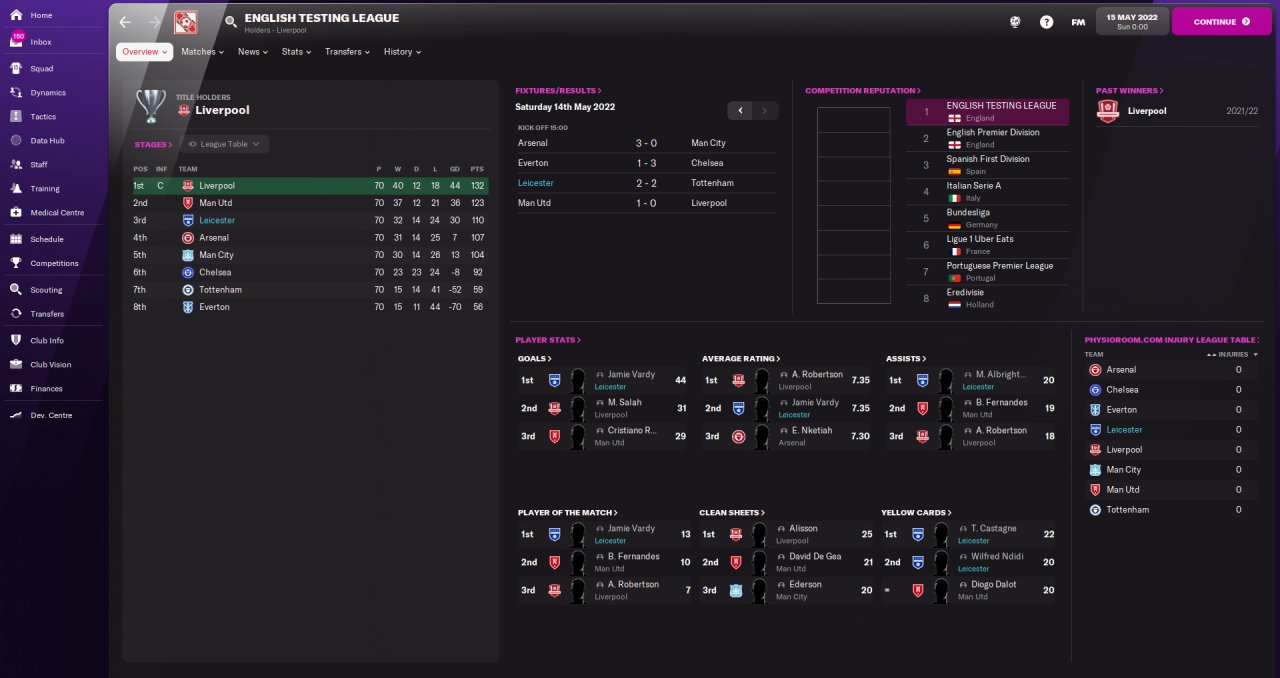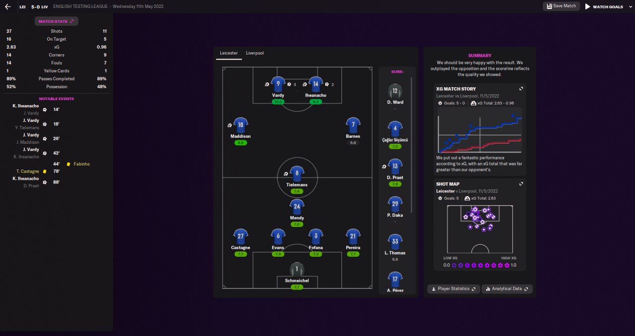 I tested the tactic in my English Testing League where Leicester have a media prediction of 7th out of the 8 teams, I finished the league in 3rd place behind Liverpool and Man Utd but ahead of both Chelsea and Man City, Vardy had the most goals in the league and Albrighton had the most assists.