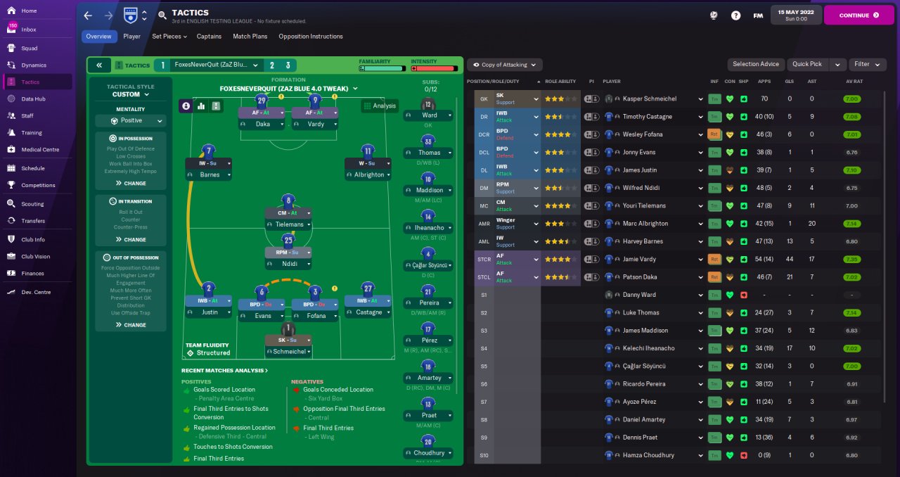 I have been working on a tweak of ZaZ Blue 4.0 which better suits the Leicester squad, I have converted the left winger to an inverted winger to fit Barnes in and I have converted the Shadow Striker to a Center Mid (Att) as I did not have a good player to use at shadow striker and Maddison and Tielemans are both better at CM.