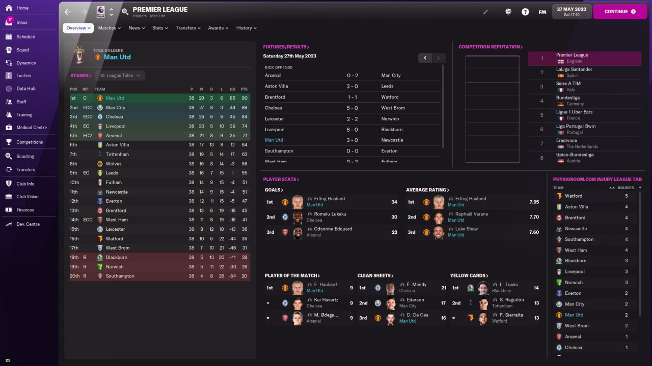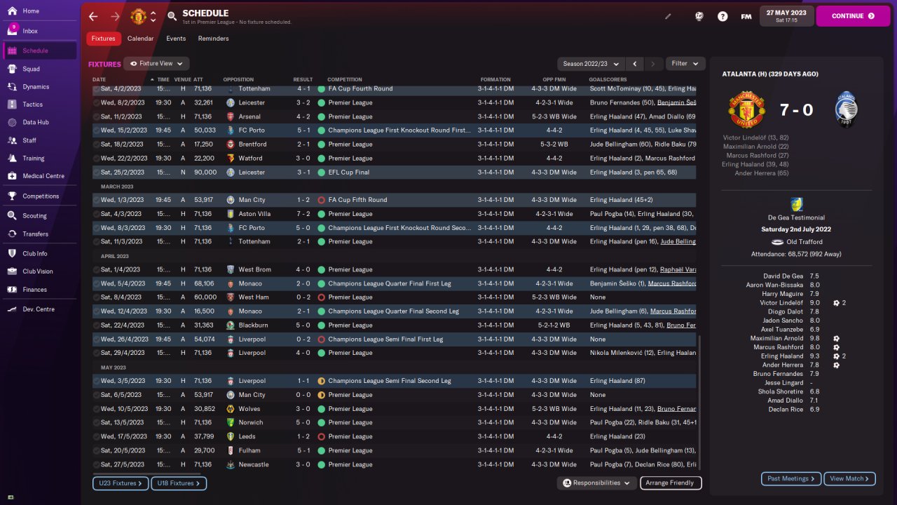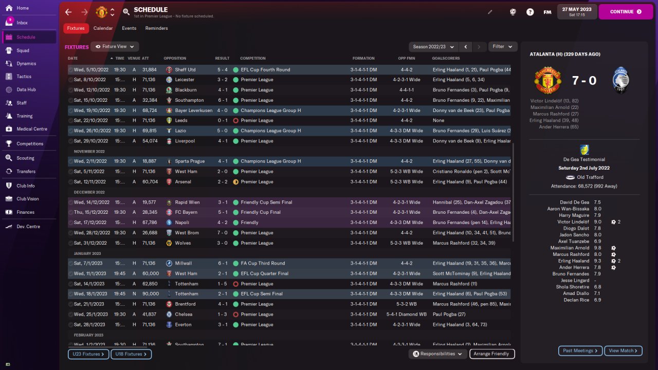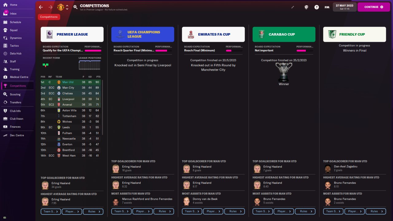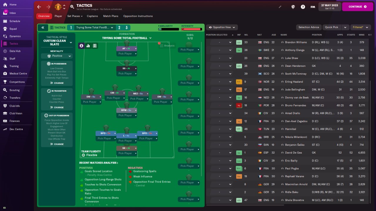 Greetings Fellow FM enthusiasts,I present to you, The "Trying Some Total FootBall" tactic. Disclaimer, I don't know if this is blatant plagiurism/ tweak or just paying Homage to a tactical guru by the name of ZAZ. I must admit that I am not a tactician, I was just lucky to make this positional tweak work this time. Most credit must go to ZAZ as this is best on probably 90% of his instructions.I must also thank the following; FmArena team for the tactics templates with built in set pieces, FmStinger for his fm21 defensive corner set up, BustTheNet for his fm19 advice about placing someone at the far post when defending corners,(RDFtactics,HoodGaming and TookaJobs whose videos always inform me about cool tactics to checkout). Now that the brown nosing is out of the way lol, Time for the tactic, I used the 433dm wide fmarena tactic template, I moved the positions around to make it a 3-1-4-1-1 diamond shape. I used the player roles and instructions from the ZAZ blue 4.0 tactic, for the team instructions, I had watched an RDFtactics video "133xg 149 goal..." I added Play for Set Pieces and Force opposition inside (I don't know if these enhanced or hindered the performance).Points to note; The set piece taker should the central midfielder on the right (mezzala) that's were I had Bruno Fernandes, Your biggest jumping defender should be the left central defender. I started using the tactic in second season with Man Utd from the 9th game of the season (10 October). Achievements= English Premier League won by 1 point over Man City, Won Carabao Cup beat Leicester 3:1 in the Final, FA Cup lost in the 5th round to Man City 2:1 and Champions League lost to Liverpool in Semi Final 3:1 aggregate.