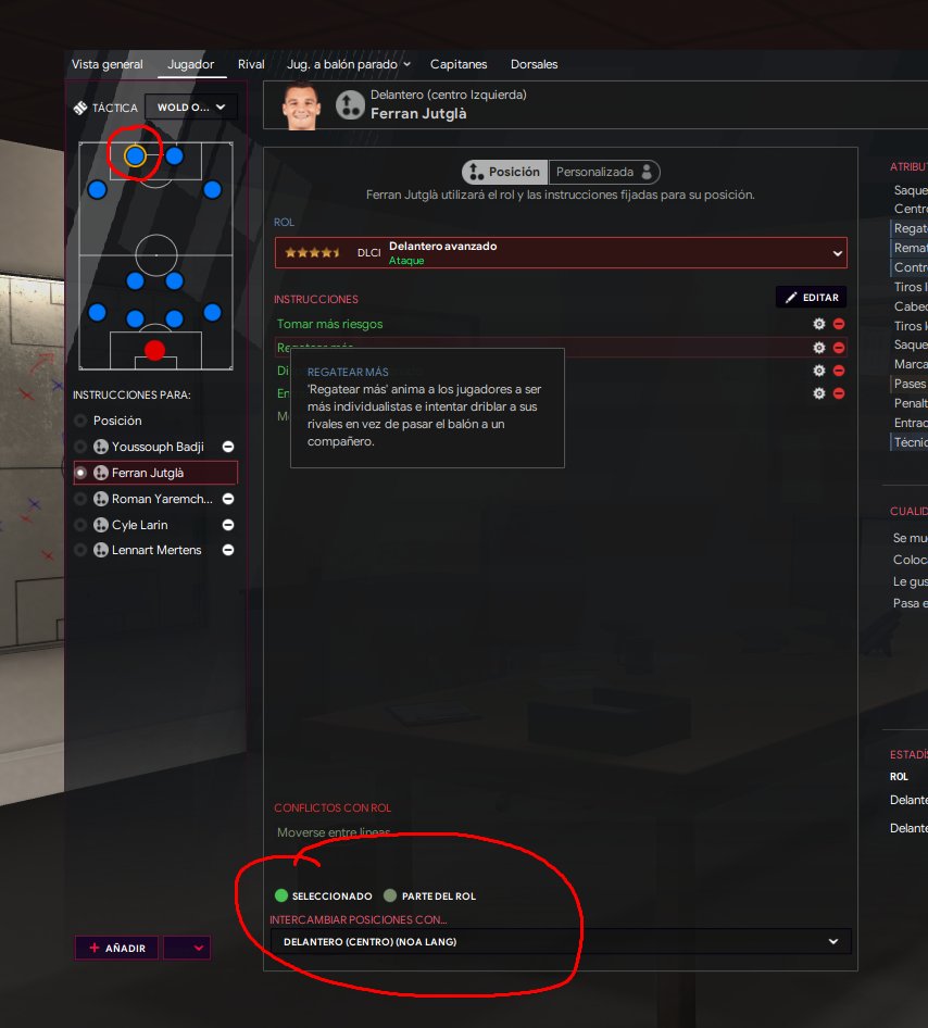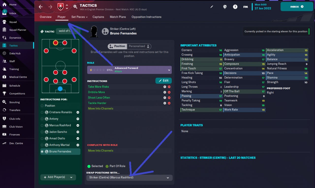 for ppl wondering how to stop them to switch positions. Theres a tab called "Player" in the Tactic section, you can click on the left striker, then look at the bottom of the screen and you will see how to stop the switch. @dungviet96@ta2199 but tactic works better if they switch