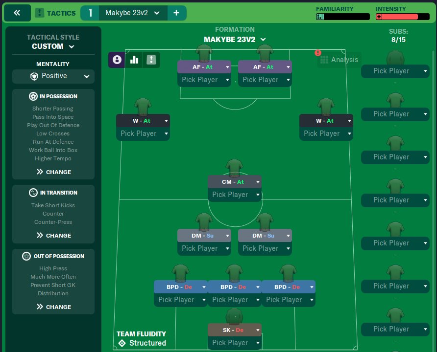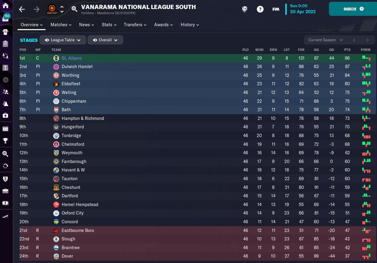 I used St Albans, predicted 16th. The first run scored 110 goals and conceded 85. Tweaked some of the settings and ended with version 2 doing sensationally well. The defence is still leaky but the scoring potential is sensational, 131 goals in the test season. I cant recall seeing a formation like this in FM23. There were 8 red cards and 123 yellows, so could probably have done a fair bit better if I was playing instead of holiday mode.