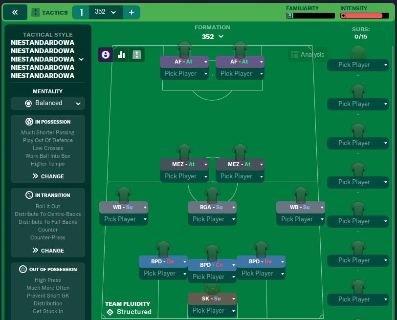 The mentality is: if you don't have good defenders - you need more defenders. So 5 at the back it is. The back 3 play wide with DM helping to build up plays. The WBs are key in offence and defense - creating chances from crosses or covering wide areas. The main threat to the goal comes from 2 strikers and 2 midfielders.