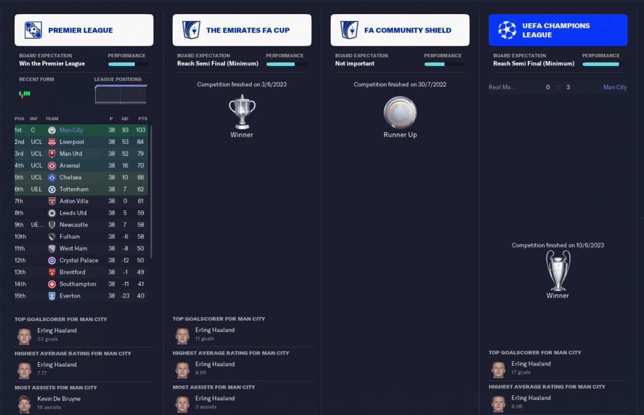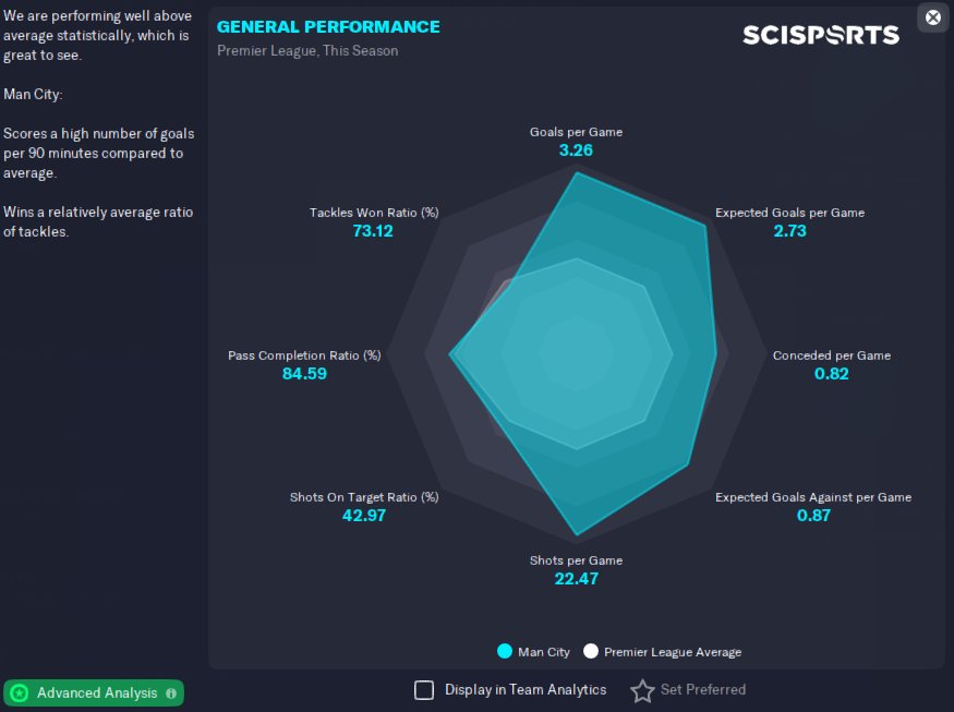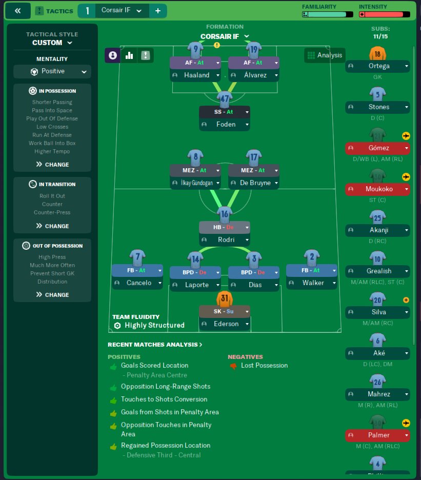 Verry offensive 4-4-2 Diamond formation, 103 points, 93 GD, 58% possession. 95 goals and 28 assists shared between the 3 strikers, 14 goals and 43 assists from the 2 players rotated as SS. Won the champions league as well without any losses.