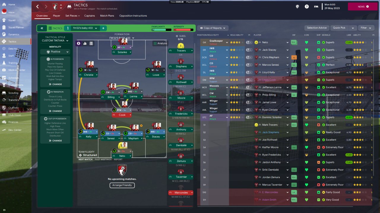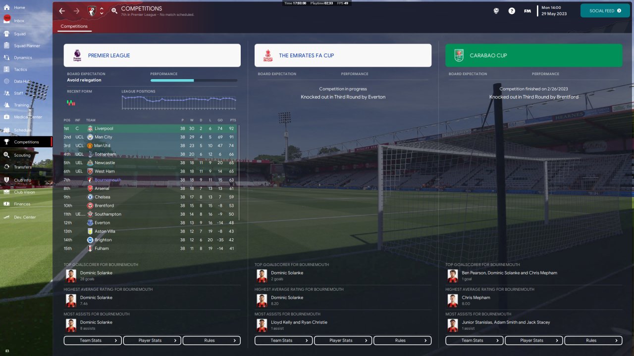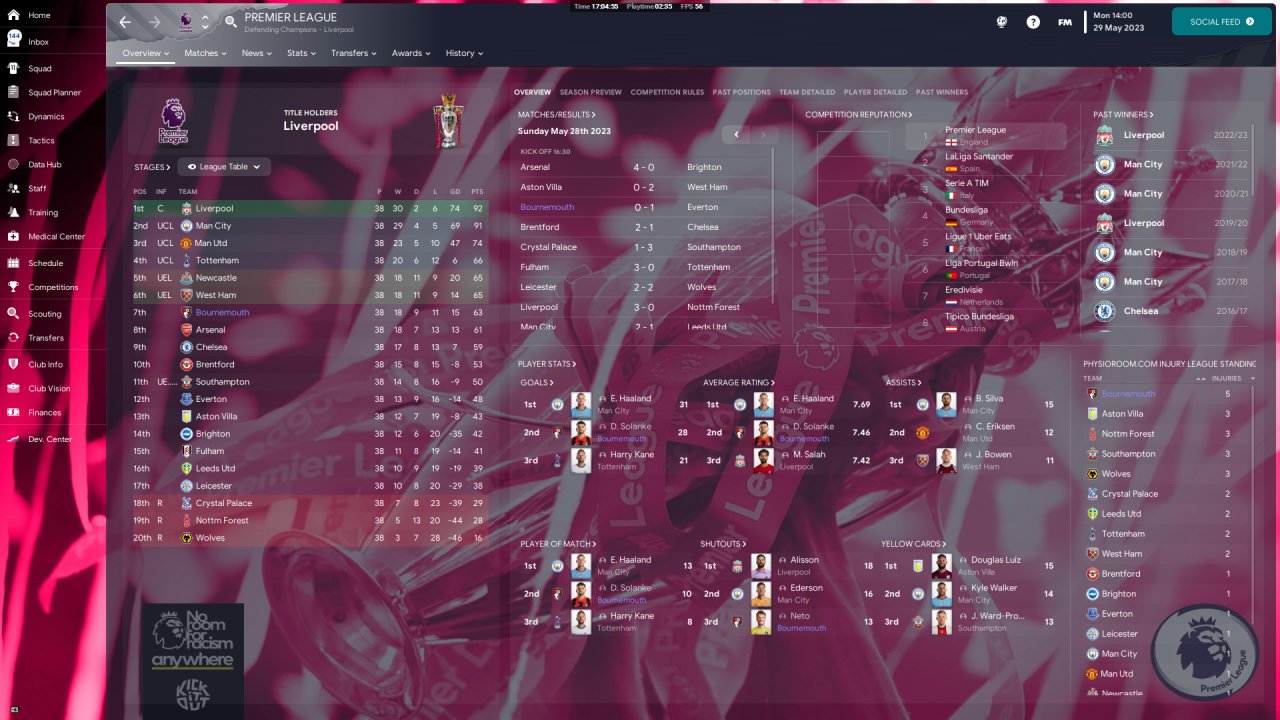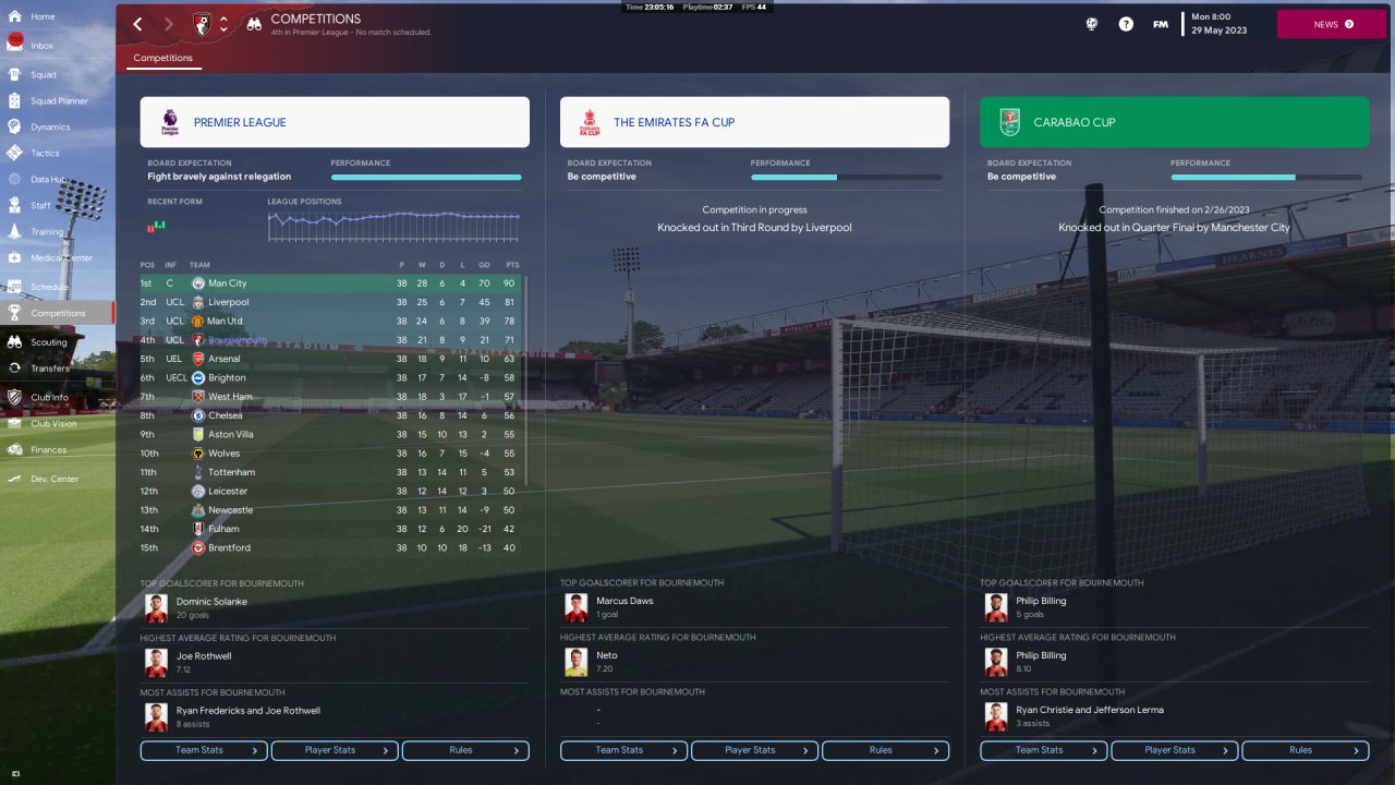 Finished 4th (UCL qualification), 1st season with Bournemouth, holiday.