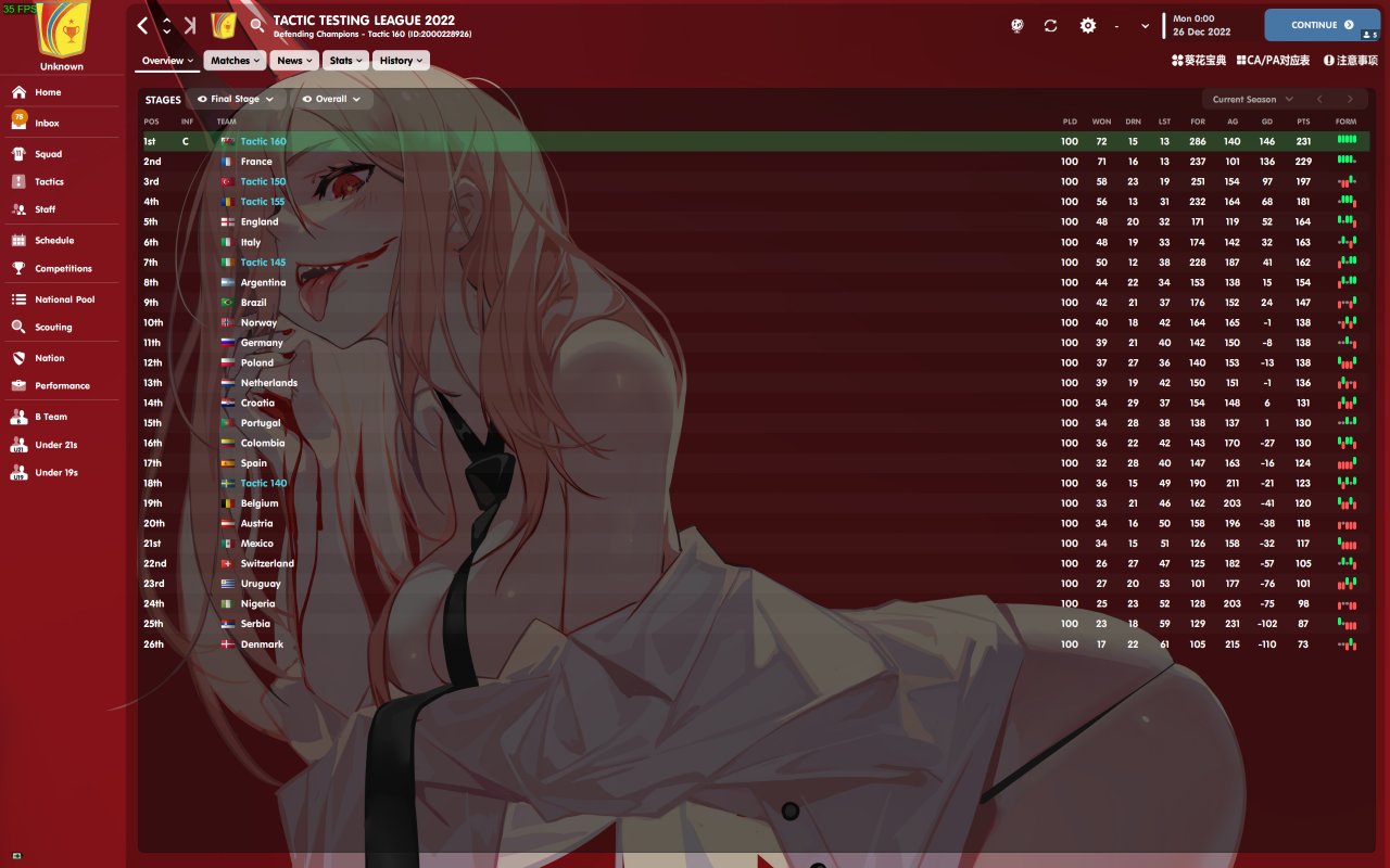 Holiday test was conducted under Tactic Testing League v2 from fm base. Much thanks to will1981.