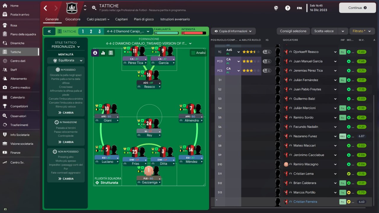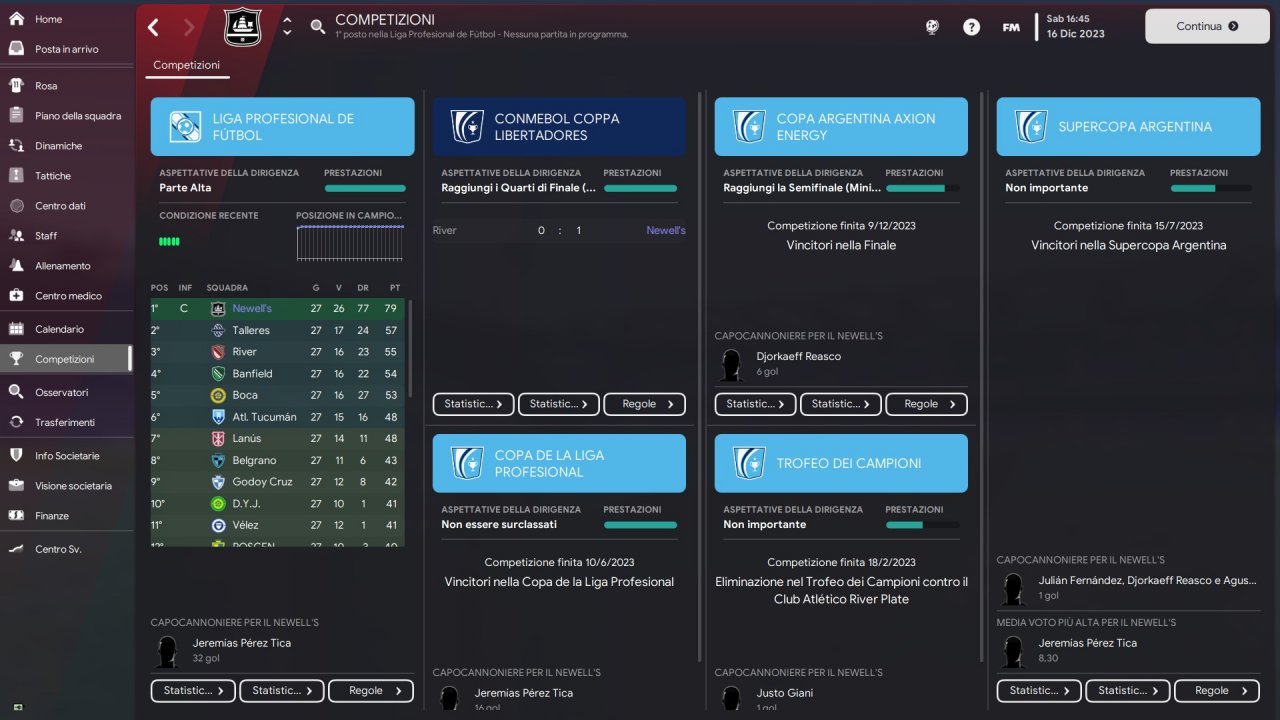 I saw on this forum the tactic of @crizeKOS and I found it very interesting. I changed some squad instructions and some in singles especially in the 4 defenders, setting their minor pressing, I got more solidity and possession. I test it with Newell's in Argentina, not the favorite for any of the competitions. These are my results( sorry for the italian language).