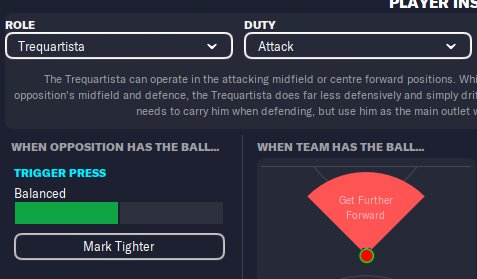 One thing I would like u guys to take notice is that TQ has the same level o press triggerin than SS despite he have the PI "easy on tackles" hardcoded. Furthermore if u compare the 3 positions TQ would be somehow a midterm in terms of attacking role...