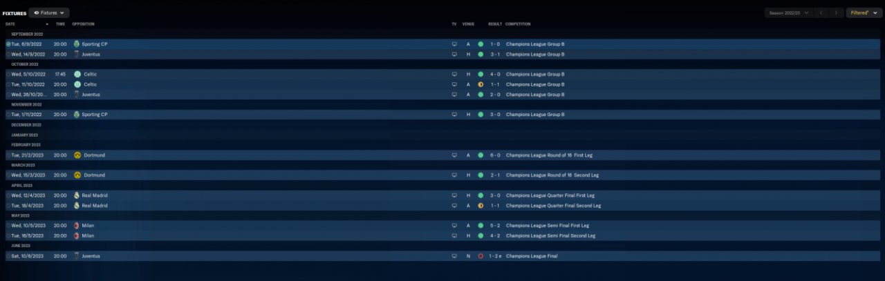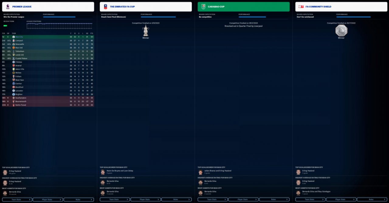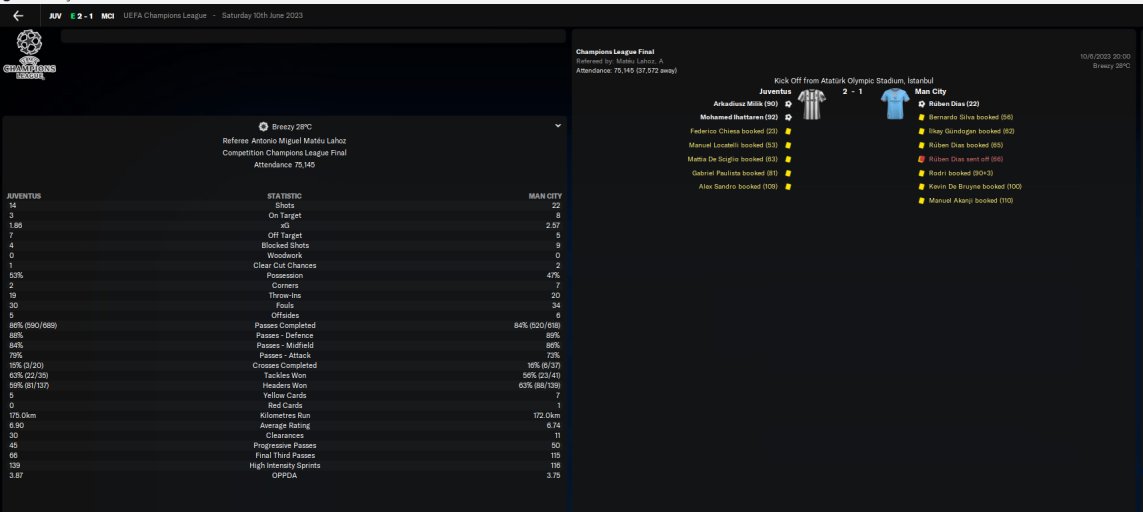 Tactic is based on this one https://fm-arena.com/thread/3150-424-zone/ created by Delicious. I have tweaked it slightly and have been using it in my traveller save. It has been successful in Brazil, France and now England. I tested it with City and the results are below. Narrowly losing out in the UCL final as Dias got a red card which led to Juve scoring 90th and 92nd minute and also no cheat code Haaland