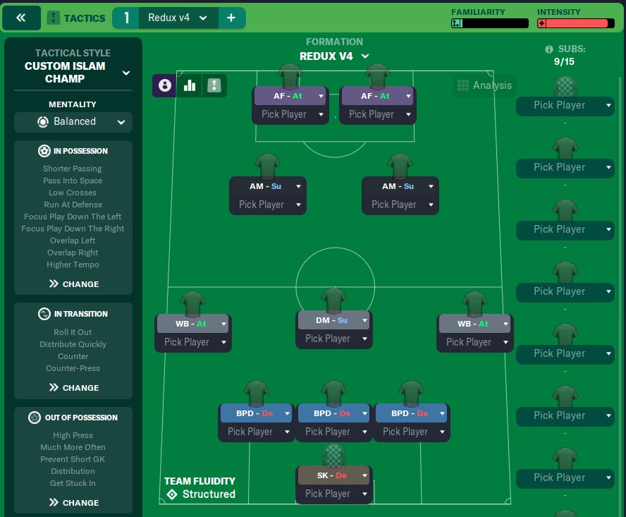A reimagining of my old attempts at a 352. Took heavy inspiration from MJK's tactic. Added PI's to the midfielders and shorter passing.