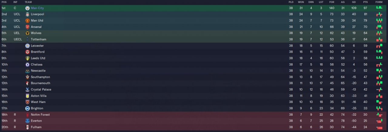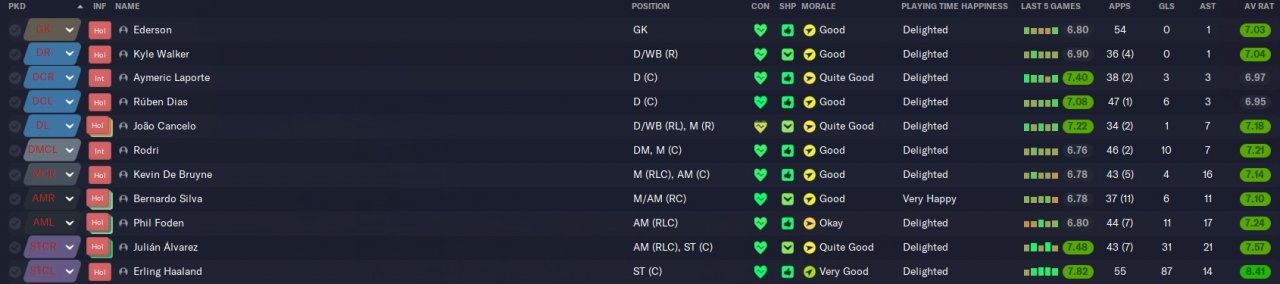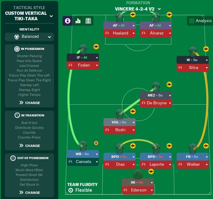 This is version 2 of a new 4-2-4 tactic I am trying to develop. Simming the full season resulted in a 97 point season with a 109 goal difference which is a significant improvement on version 1. Again most of the points dropped were in away games with the only points dropped at home coming against wolves on the final game of the season. To improve the testing process a few players versatile in multiple positions were added to the man city squad to reduce the impact of injuries on the testing.