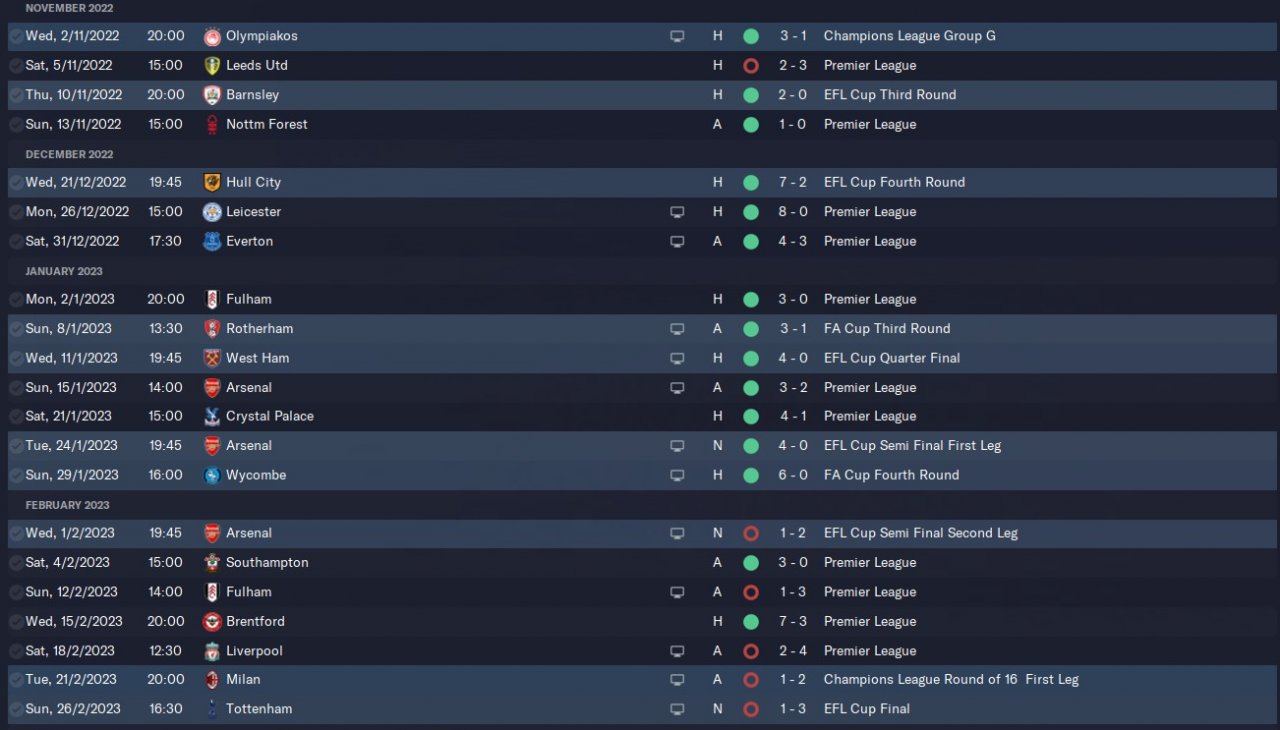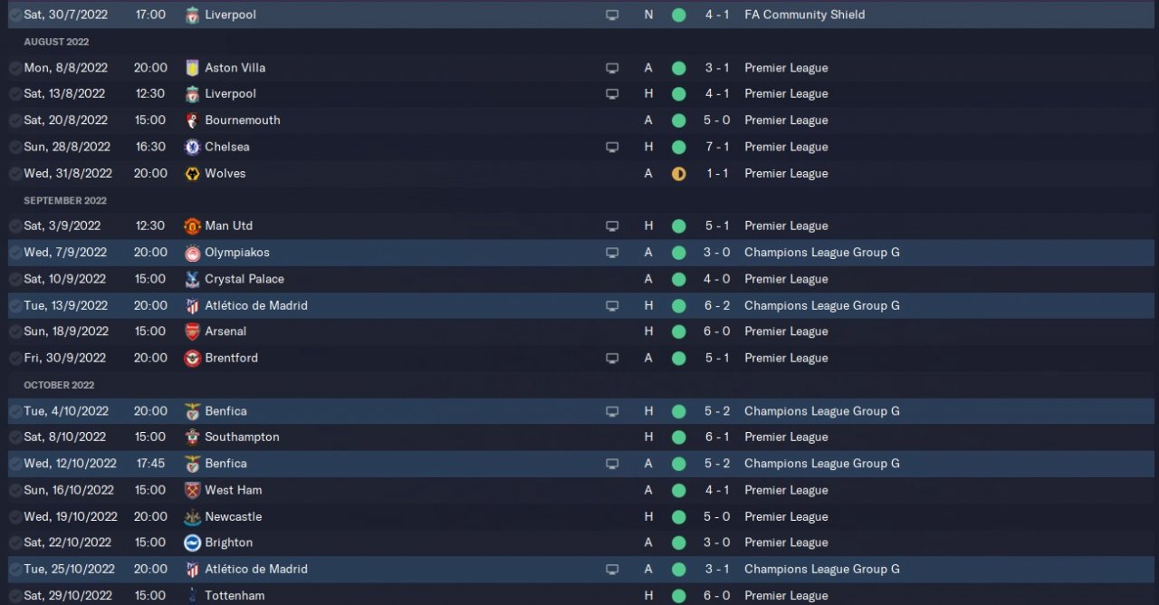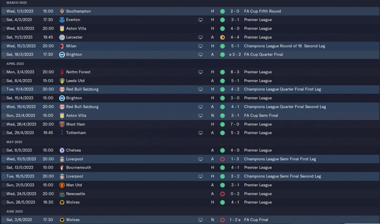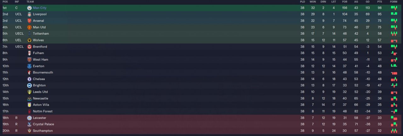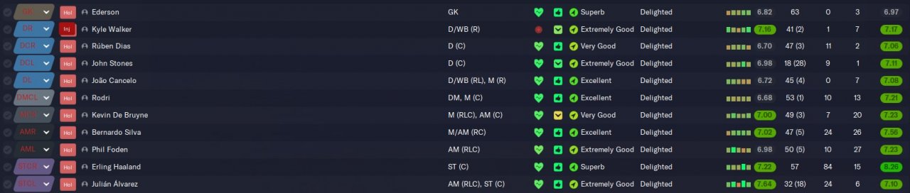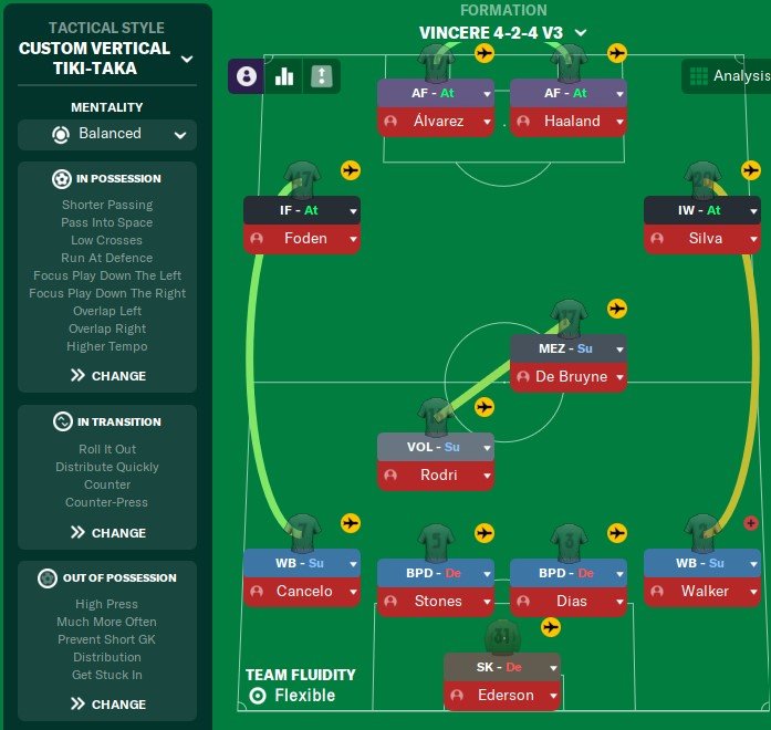 This is version 3 of a 4-2-4 tactic I am trying to develop. Simming the full season resulted in a 98 point season with a 113 goal difference which is a slight improvement on version 2. Again most of the points dropped were in away games with the only points dropped at home coming in a loss against Leeds. Of the 6 games where points were dropped 3 were due to bad luck. The 3-2 loss to Leeds involved Grealish being sent off in the 1st minute of the match. The 4-4 draw against Leicester had Di Lorenzo getting sent off in the 9th minute. Finally, the 3-1 loss against fulham saw man city only convert 1 chance from a 4 xG where the hosts scored 3 from a 1 xG. With a more controlled test and slightly better luck this tactic could easily produce an +100 point season.