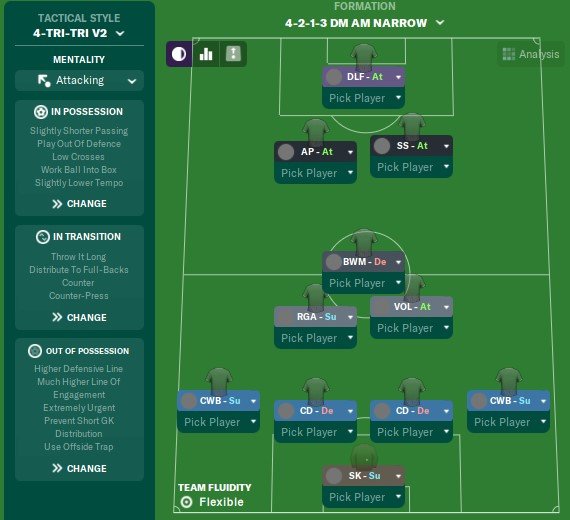 The idea behind it is to have two triangles heavier at the bottom in defence but flipping round in attack. The width is provided by the CWBs and the aim is to have a patient breakdown is the initial counter breaks down.