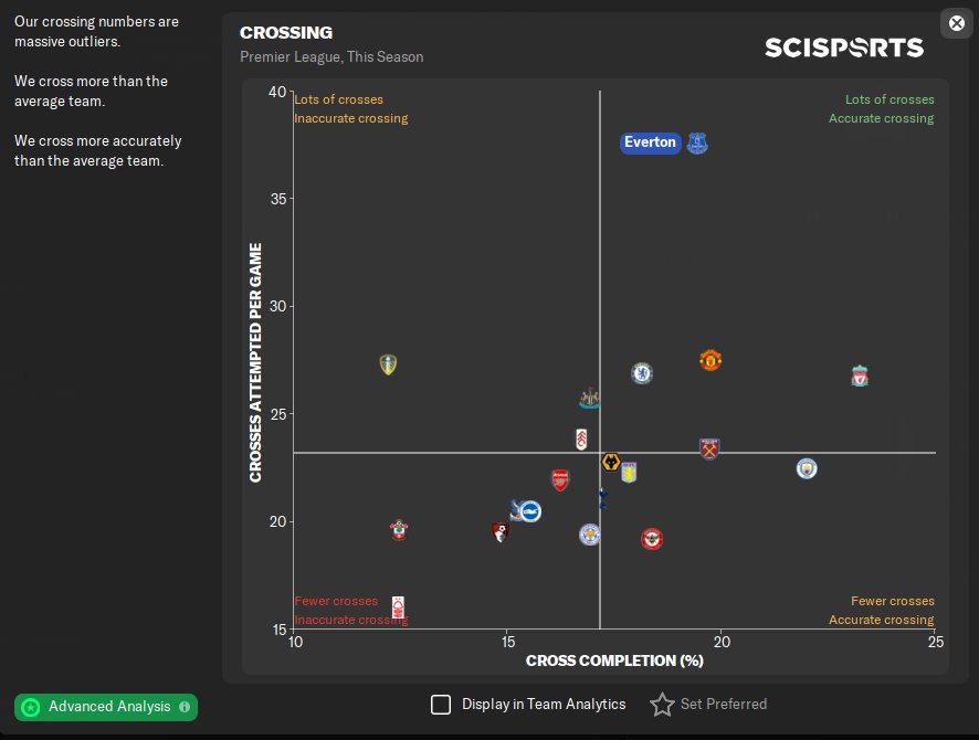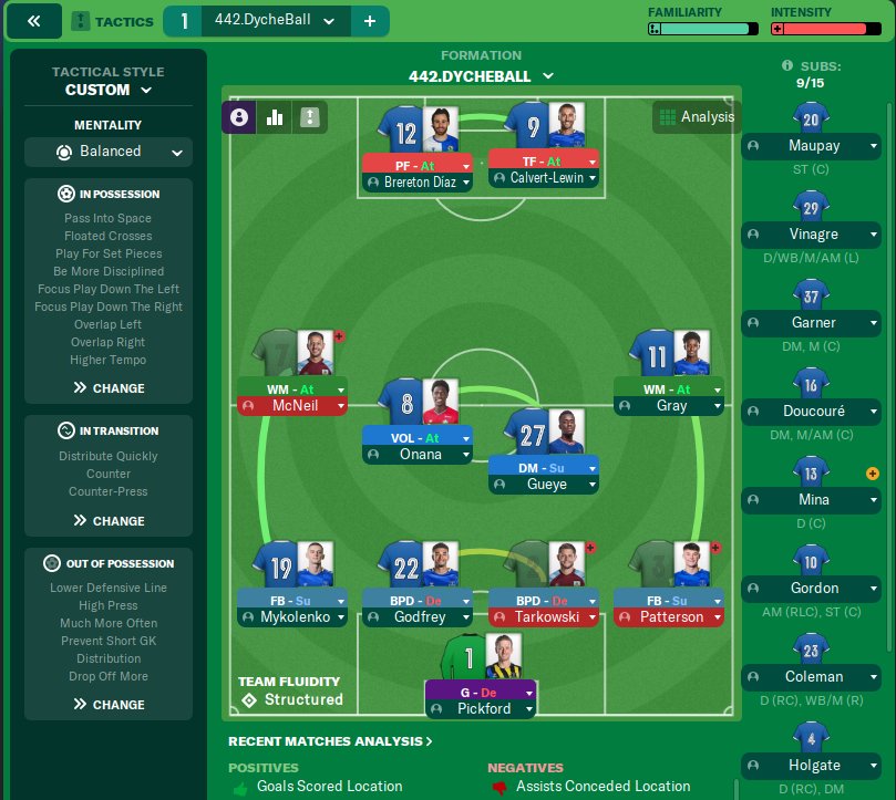Inspired by the great Sean Dyche. Tested with Everton, made one transfer and brought in Brereton Diaz because Everton lacked strikers for a 442. Tested on holiday mode, but I went off holiday every 1-2 months to remove unhappiness. Set piece tactics are not mine.