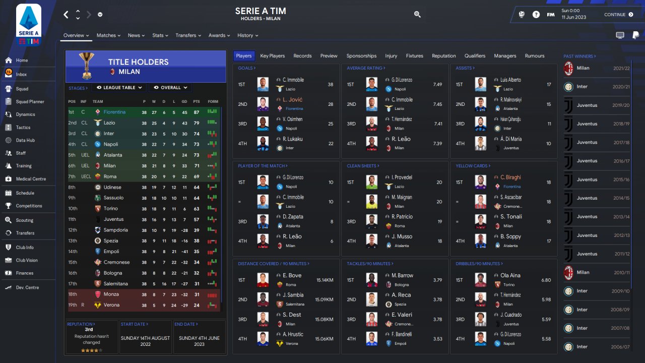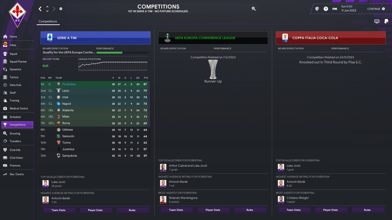 Fiorentina - Preview: 8th - Finished 1st - 45 GD - 2.37 goals per game.