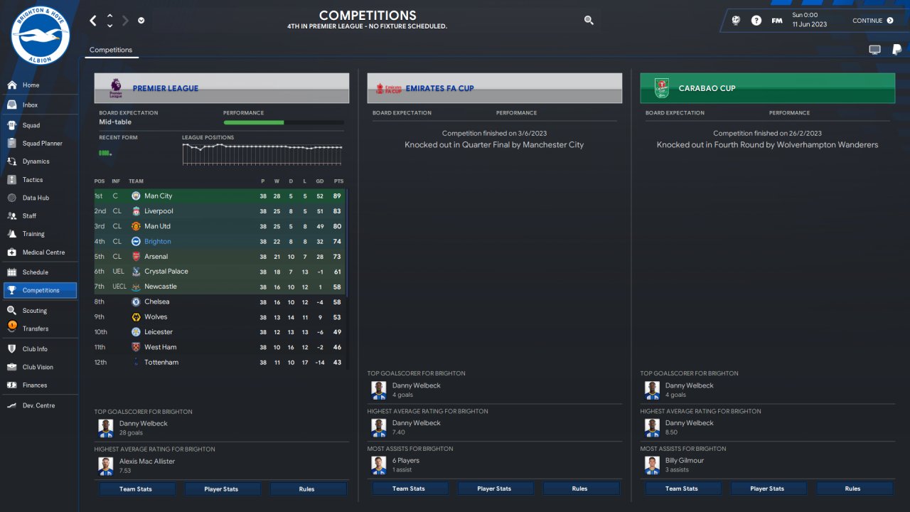 Brighton - Preview: 13th - Finished 4th - 32 GD - 15.32 shots per game.