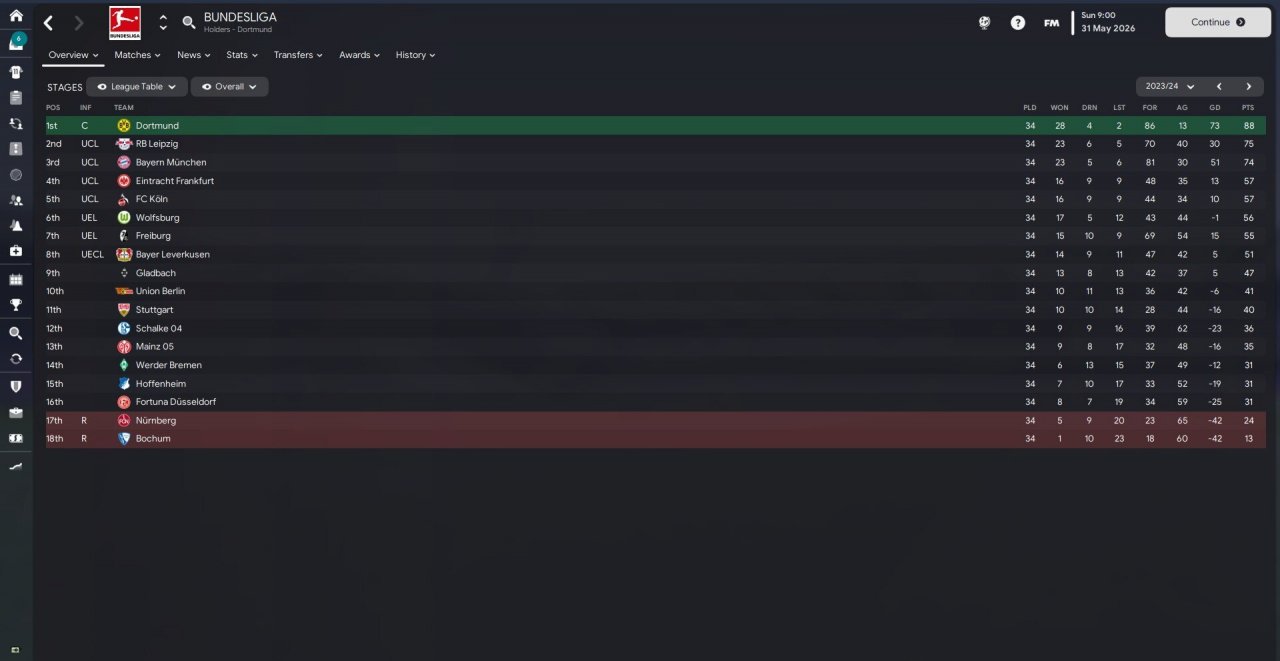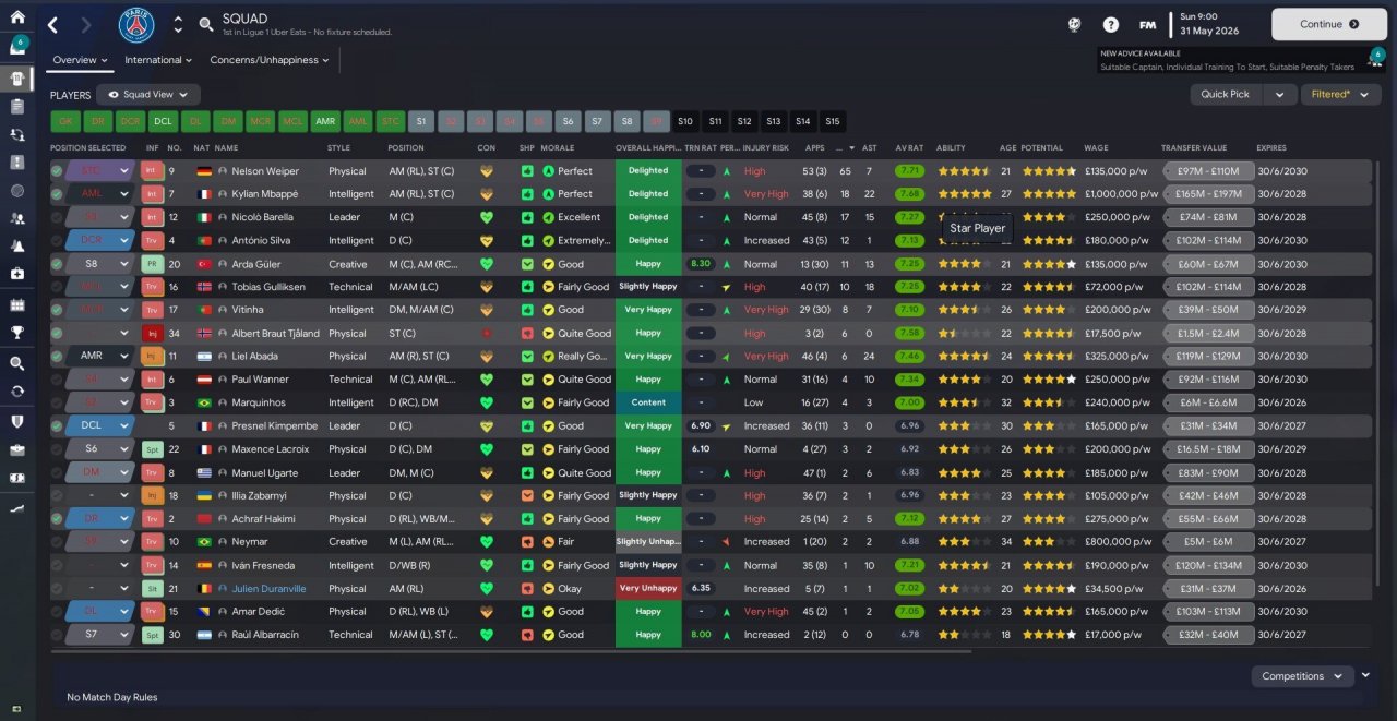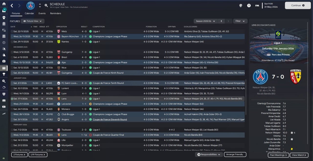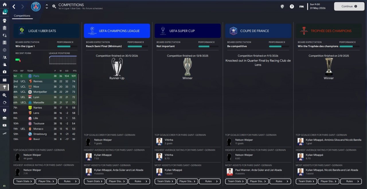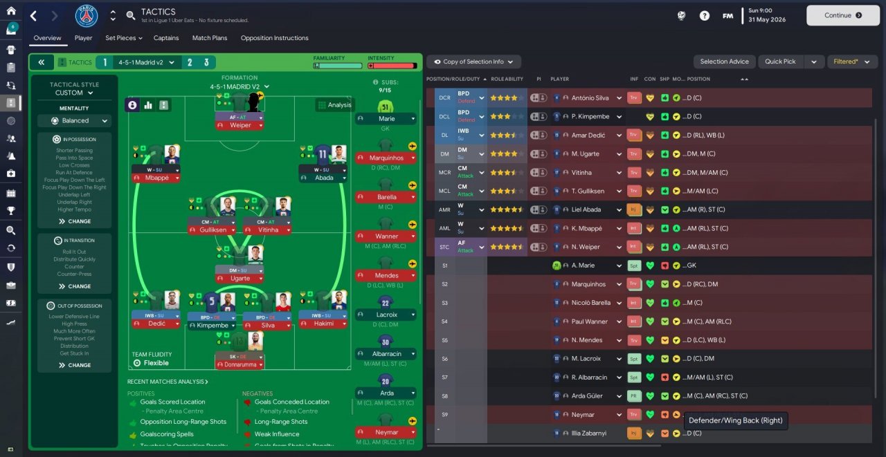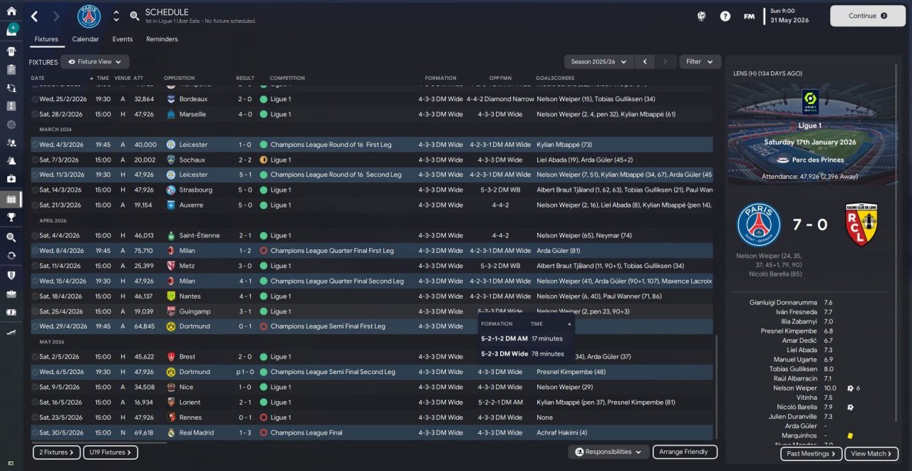 Second season in to a Glory Hunter save. Won the league year 1 with Dortmund, Season 2 won the league, Pokal and Champions League before moving on to PSG who had an opening, won the league and champions league first season but season 2 with this team conceded just 9 goals. I know its PSG but on this FM i've been used to conceding at least 20+. Not sure it works on holiday as I've played every game but it's solid.