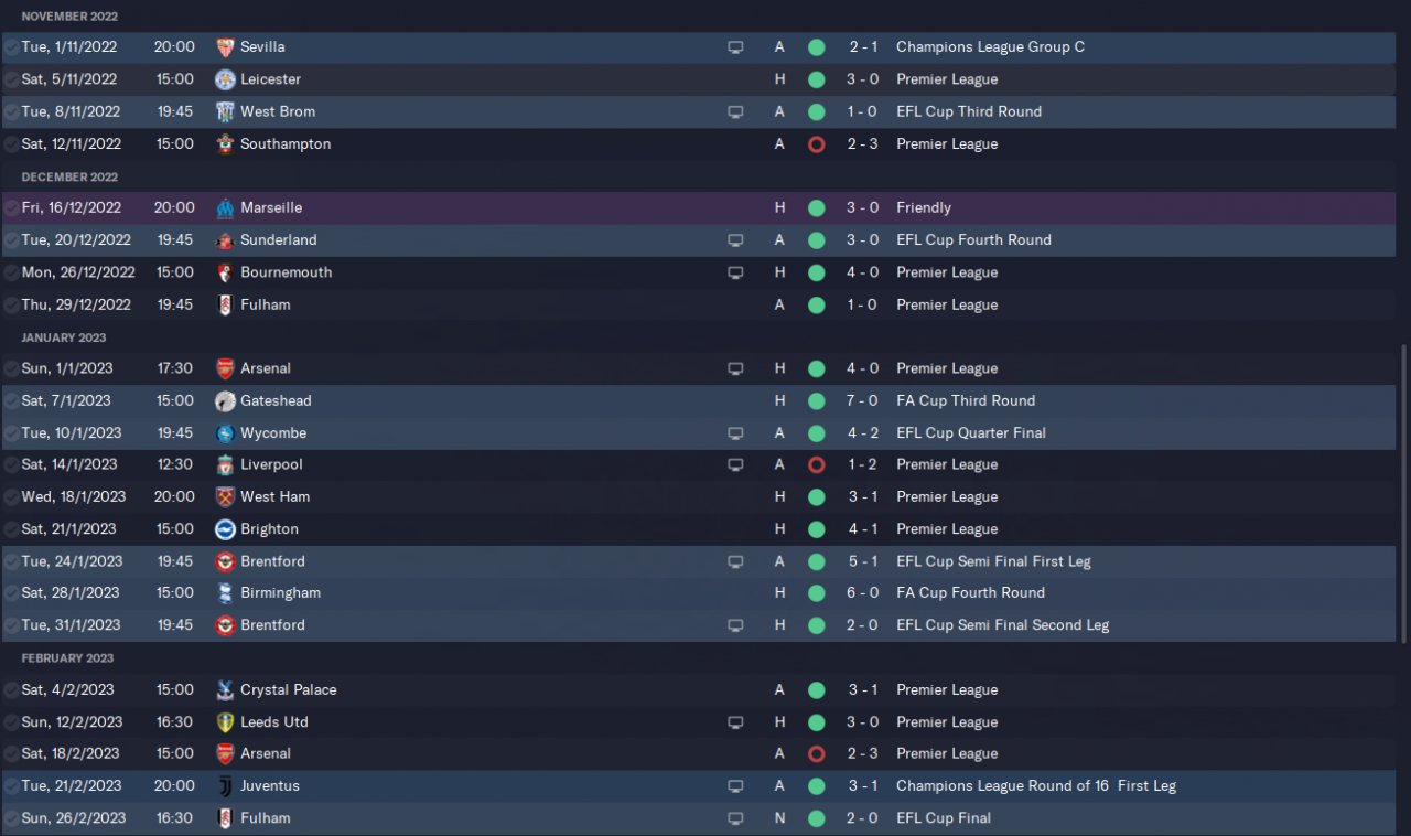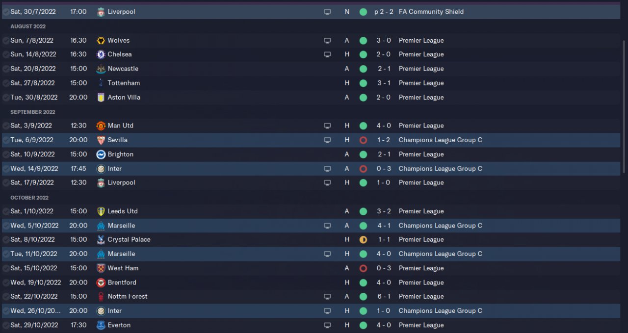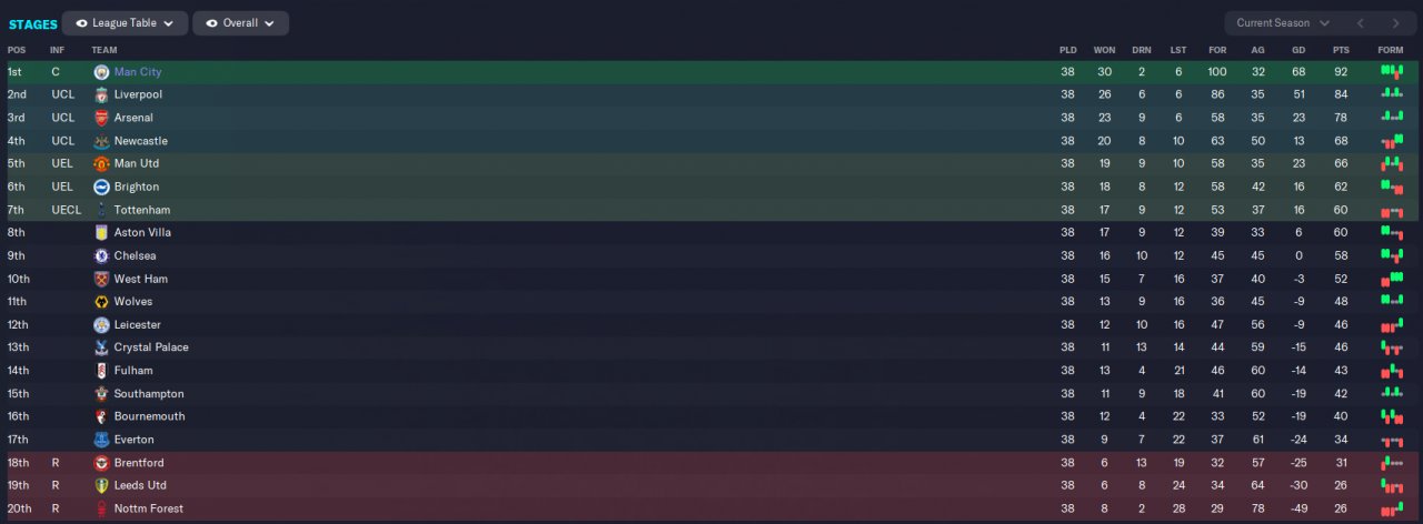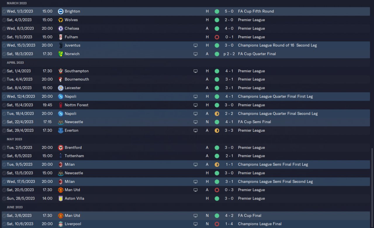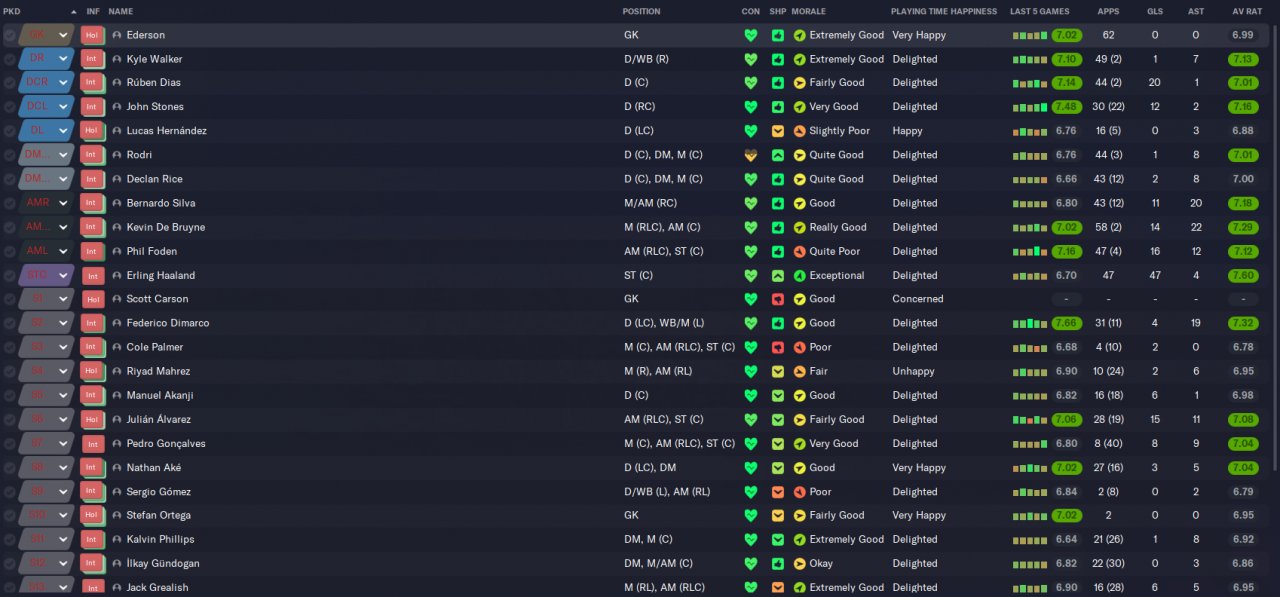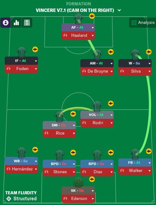 Version 7.1 of this tactic 4-2-3-1 with the AM on the right side. Won a treble with City and a red card in the UCL final preventing a quadruple. Haaland's broken foot led to him missing a 1/4 of the season which affected the overall league points.