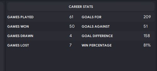 Just wanted to say that this one so far , i doubt it ranges in the high 50s. It overperforms even in away games and its also not your copium 3 forward strikers tactic. I prefer it that way. It wins a lot , like a lot. Good one. Might i suggest to bring back the score ranges?