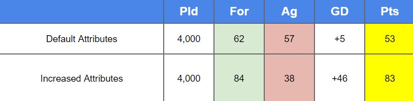 As you can see increasing 11 attributes by +2 points improved the result by about +30 points ( 60% boost ), no way, such huge improvement can be achieved by tweaking or changing your tactic because as I said, look if you look at the results of our recent tactic testing then you'll see that there's about 15-20 different shapes at the top but the different between them is only about 2-3 points.