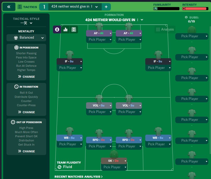 424 is a really good formation for the current engine, it has been studied to the extreme, and there are many almost duplicate works. I did a test where I used the regular IFS+WBS+VOLS combination, which combined reduced shots and risky passes to create different offensive panel Settings with the same effect. In my limited testing, there were four different Settings and it was hard to tell which was better.