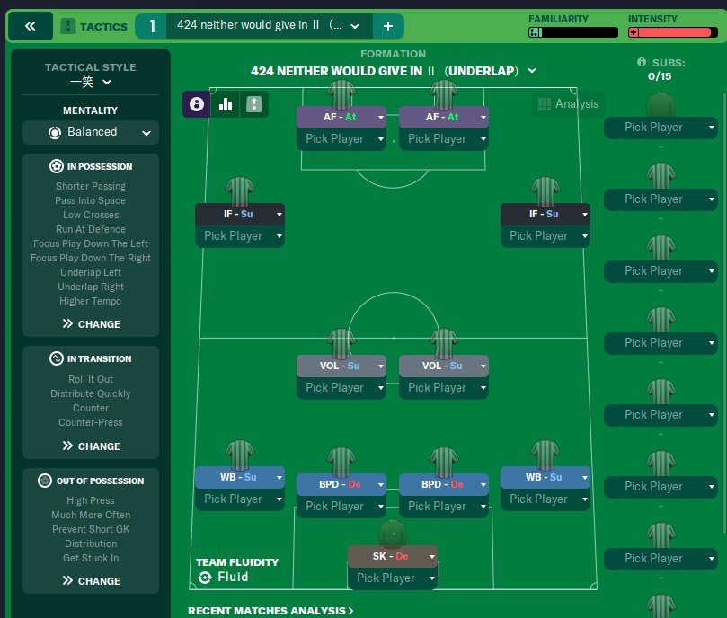 424 is a really good formation for the current engine, it has been studied to the extreme, and there are many almost duplicate works. I did a test where I used the regular IFS+WBS+VOLS combination, which combined reduced shots and risky passes to create different offensive panel Settings with the same effect. In my limited testing, there were four different Settings and it was hard to tell which was better.
