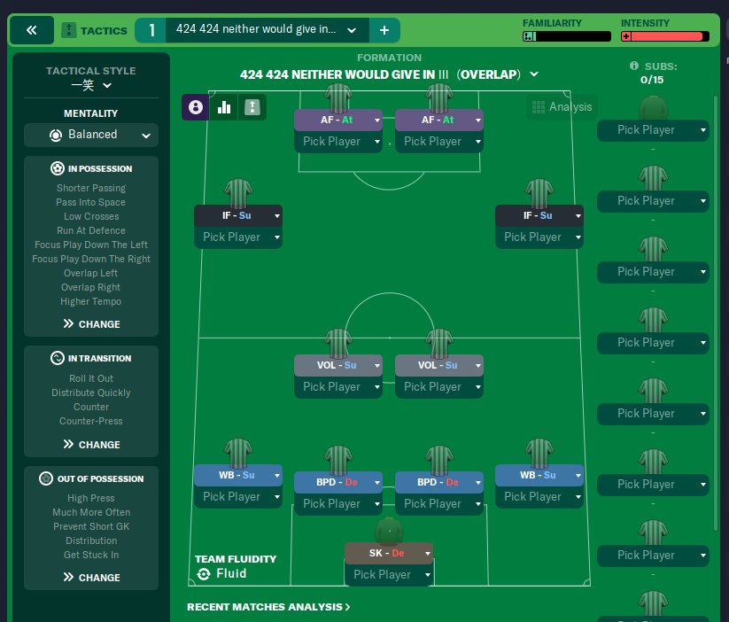 424 is a really good formation for the current engine, it has been studied to the extreme, and there are many almost duplicate works. I did a test where I used the regular IFS+WBS+VOLS combination, which combined reduced shots and risky passes to create different offensive panel Settings with the same effect. In my limited testing, there were four different Settings and it was hard to tell which was better.