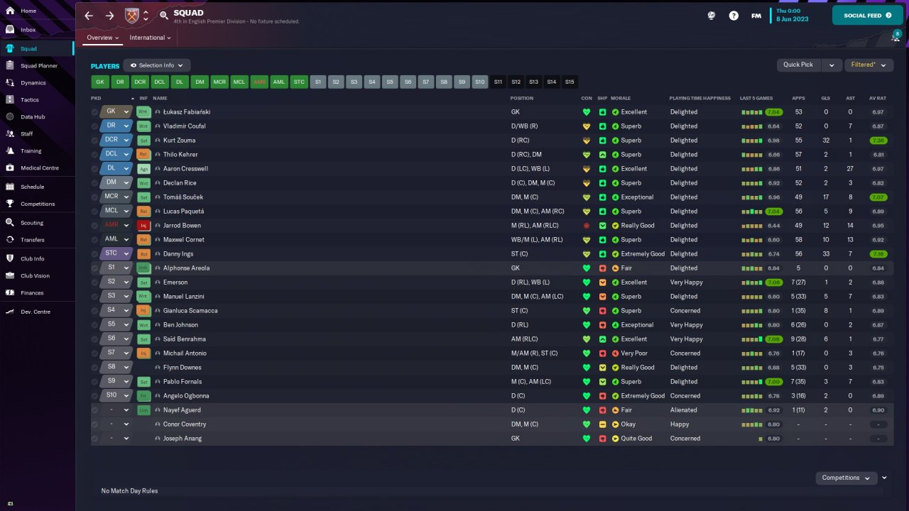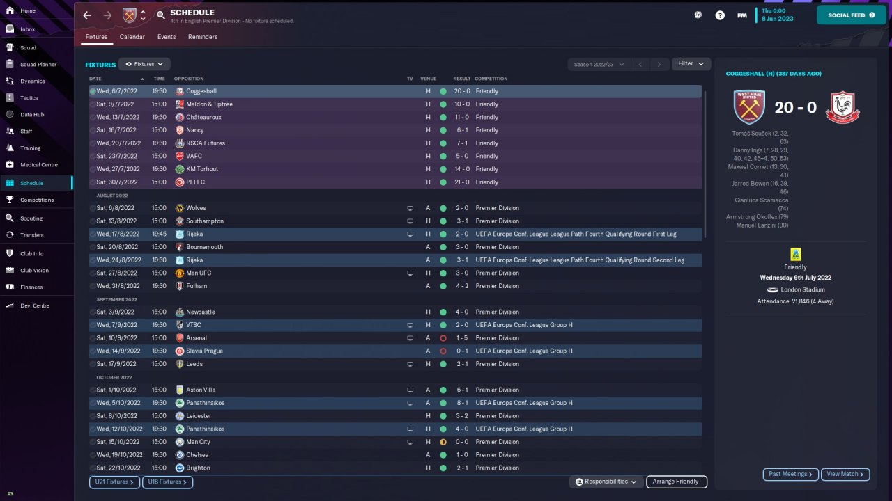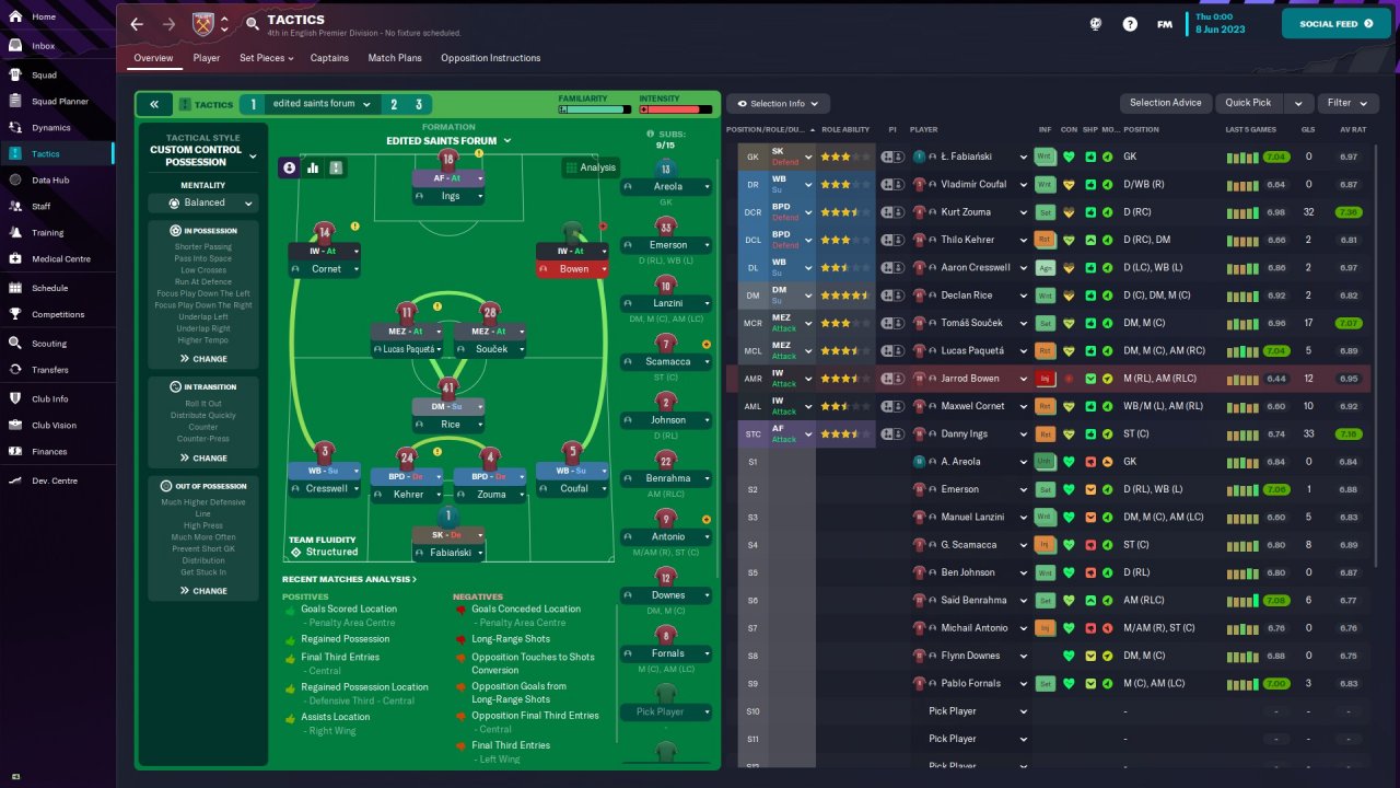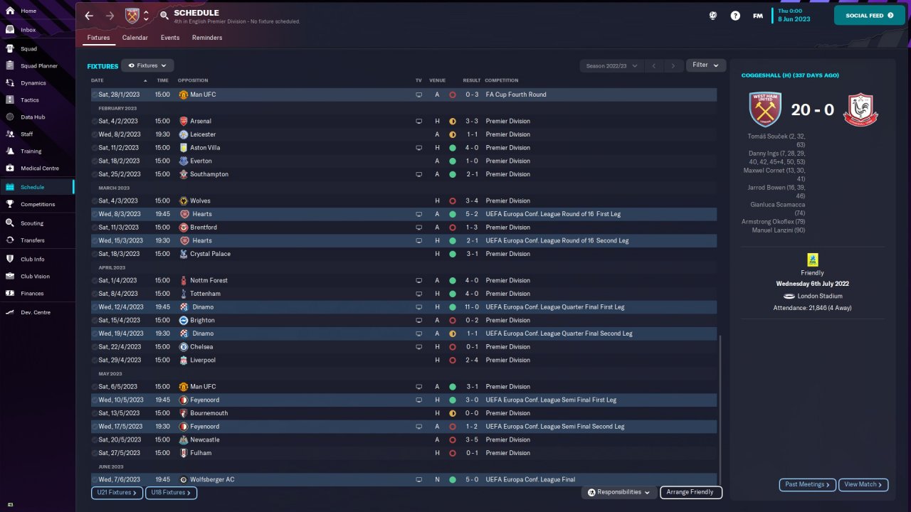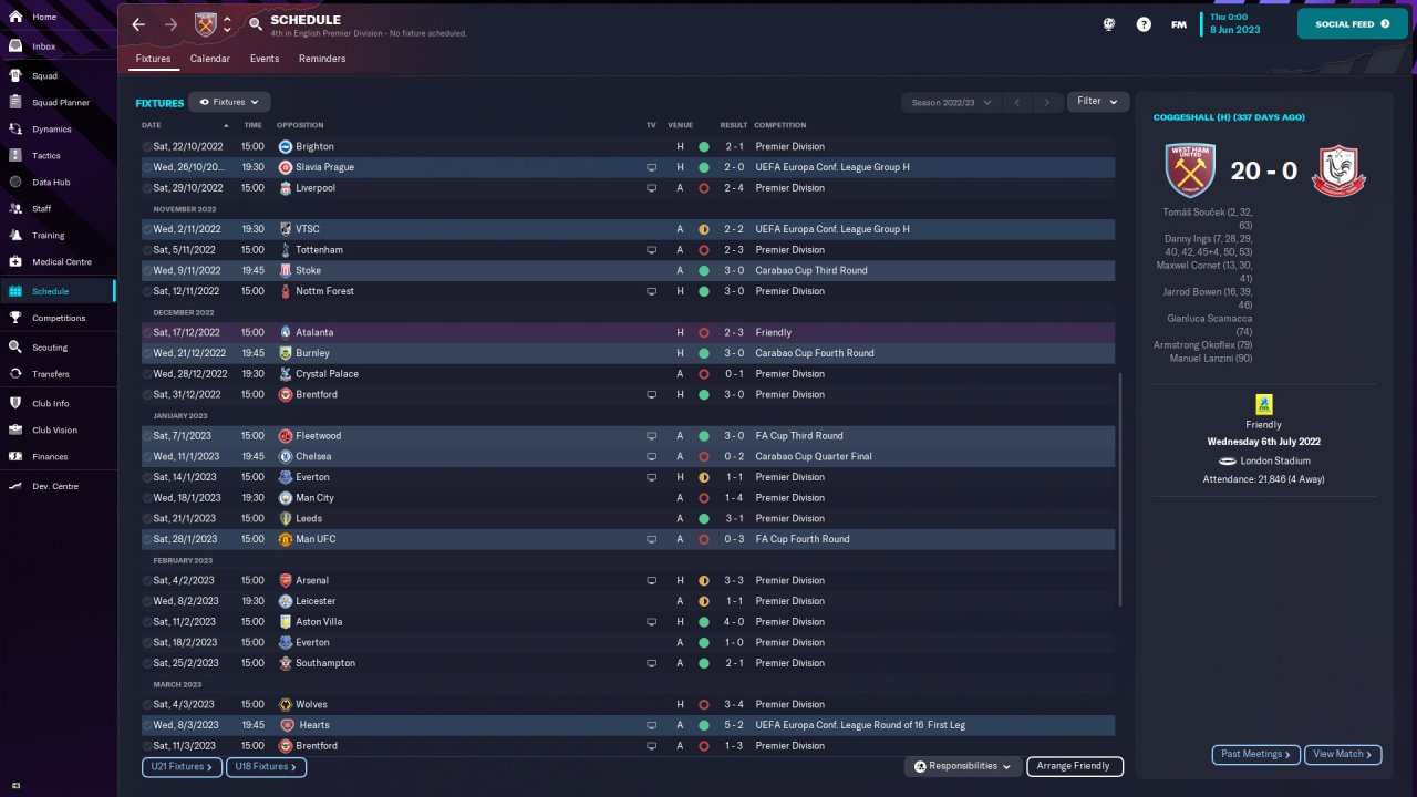 I feel that the tactic getting West Ham into the top 4 with 21 wins as well as winning the Conference League is a mighty achievement for a system with no transfers or human input. I would like to test this with my real Southampton save later on, but wanted to see how it did on the FMArena table before I did so.