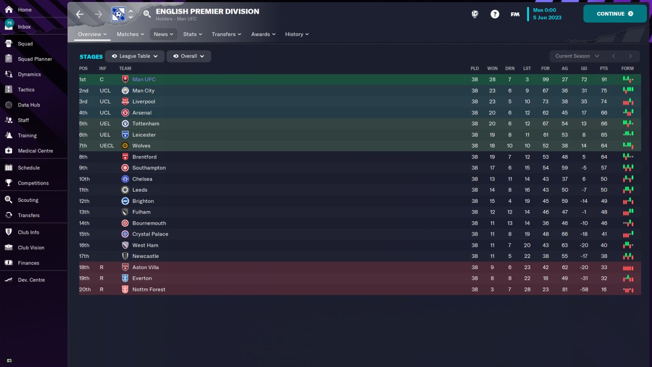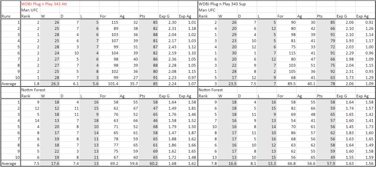 3. I have attached the holiday run results of this tactic. I have chosen Man UFC and Nottm Forest for the holiday runs. The left side of the table are the results of this tactic, whereas the right side of the table is for this tactic: WDBJ Plug n Play 3-4-3 Sup. The only difference is that the PF has an attacking role versus a supporting role. Most importantly, these holiday run results have completely no meaning. Please don't misunderstand that I am trying to properly test tactics in such way, or else I won't post it here to ask for testing.