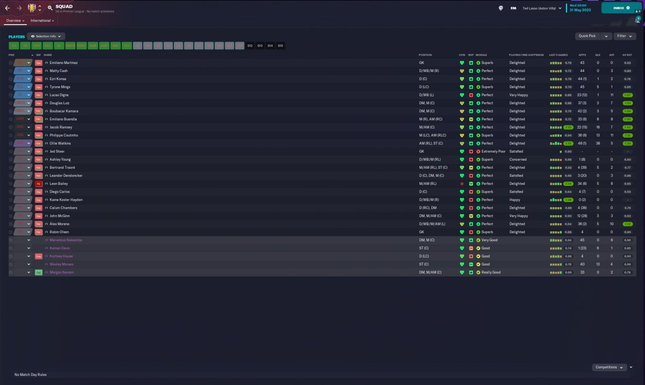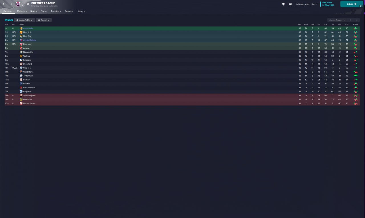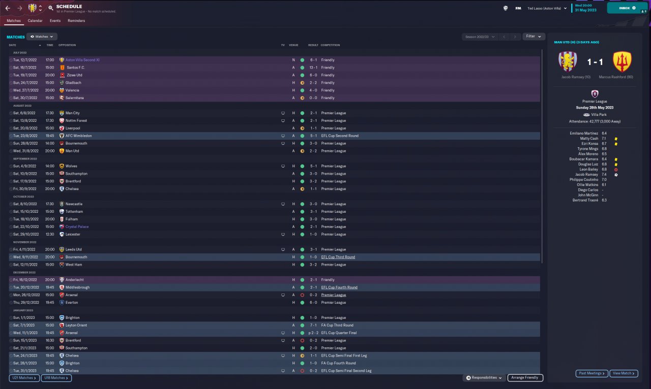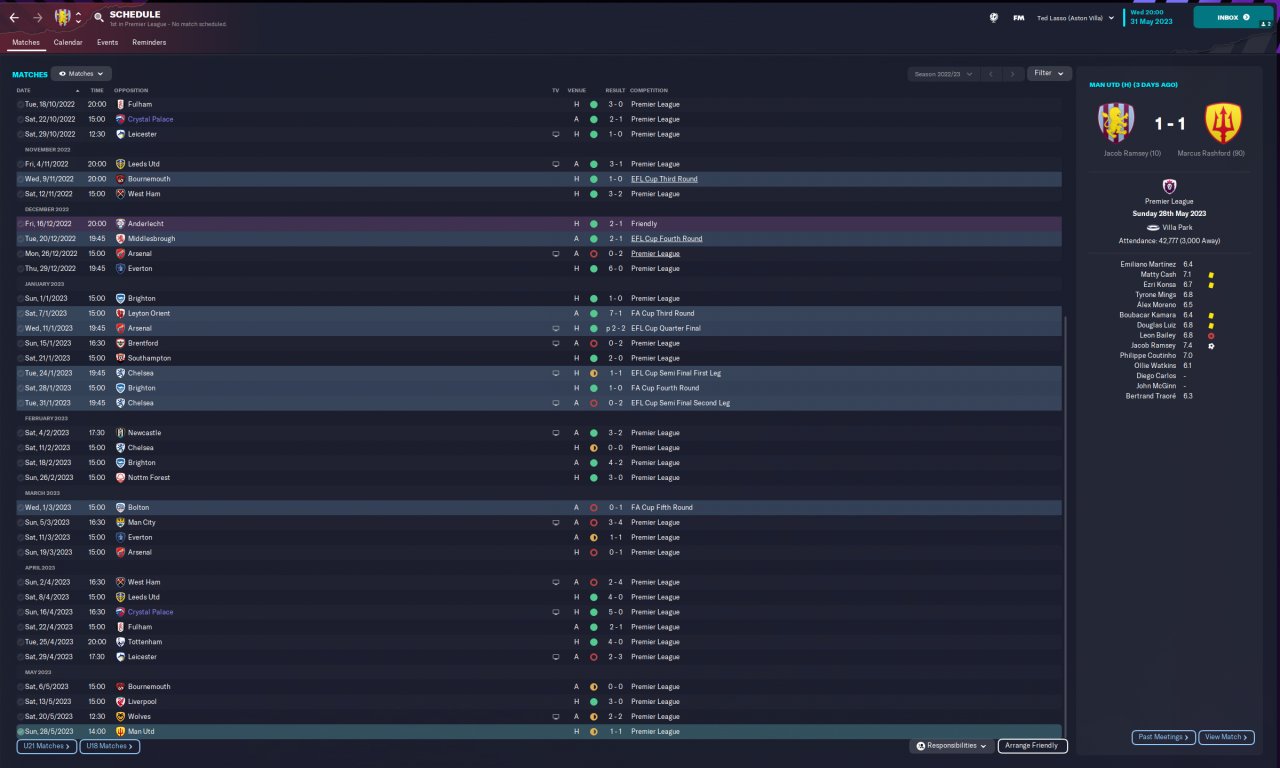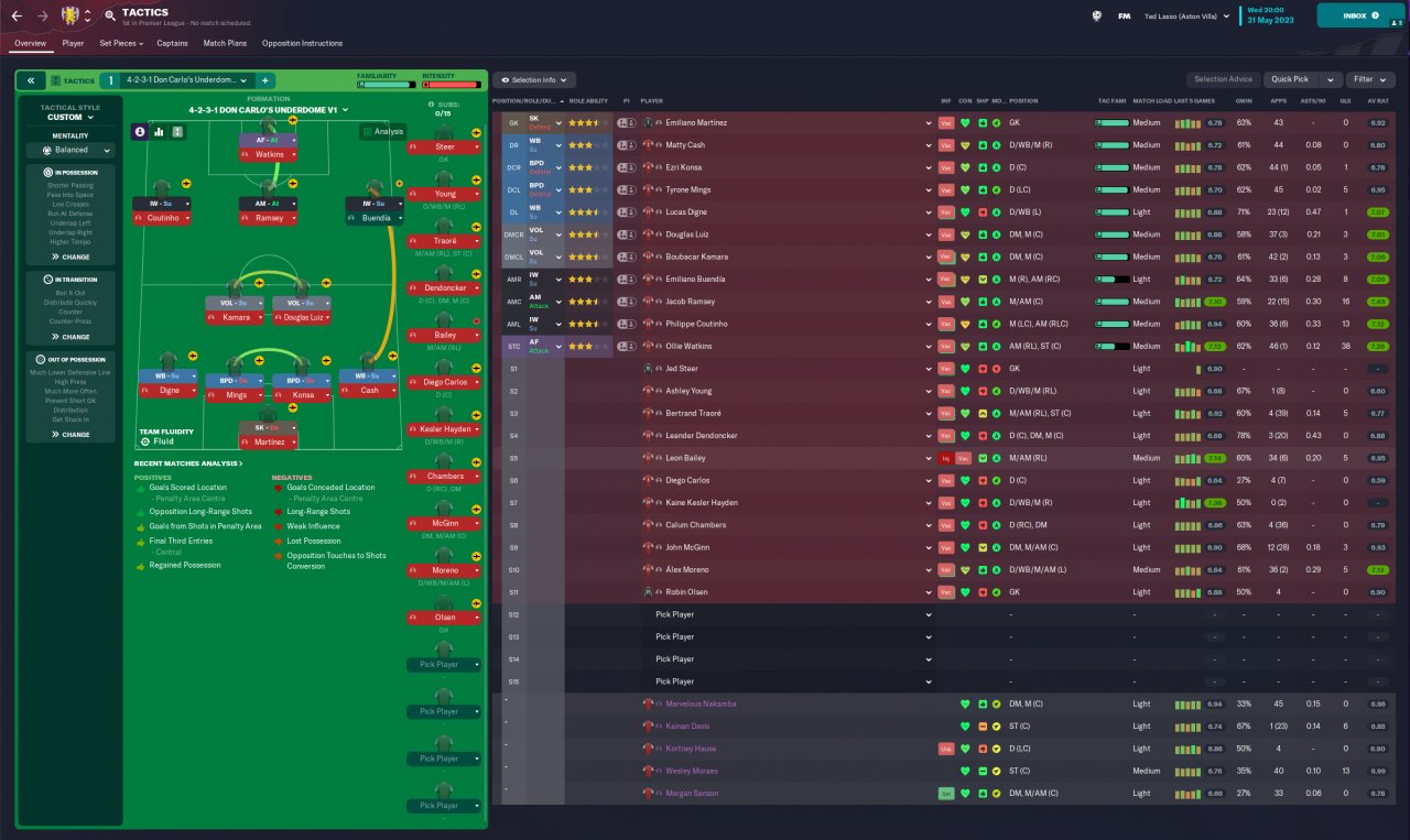 4-2-3-1 is the most used tactic in PL as of 22/23 season. I have seen meta tactics mostly in 2 forwards formation. However when I play that I saw players mostly play long balls to the flanks when pressed by the opposition so I felt that more support/options are needed in the midfield. Therefore I went with double volante on support and an attacking AM to fill the gap in the middle. Also wing backs play like inverted wing backs and fill the gaps created by volantes when attacking as they are instructed to "Get Further Forward". Here are the results: