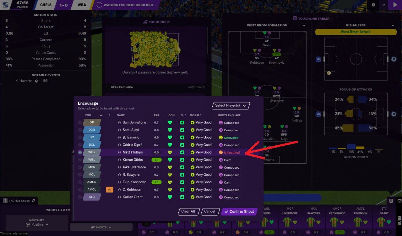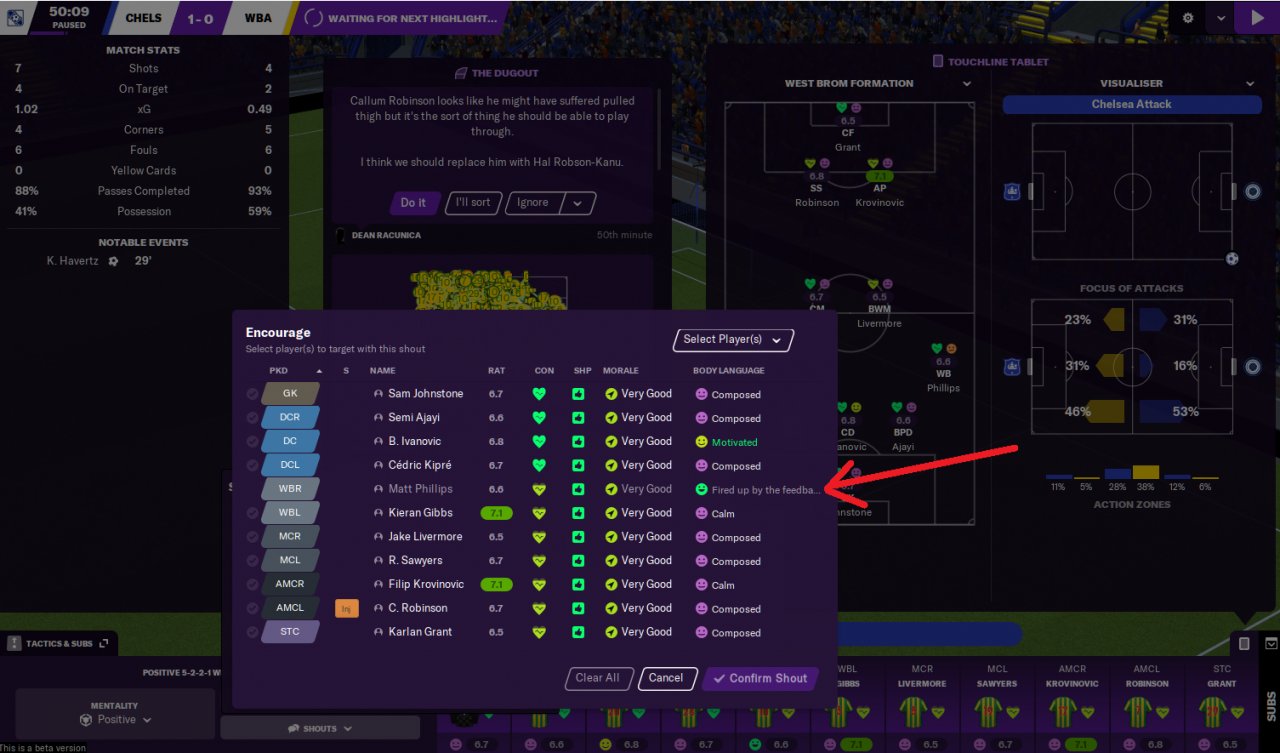 By using the Touchline Shouts you can affect the morale / body language of your players during matches.